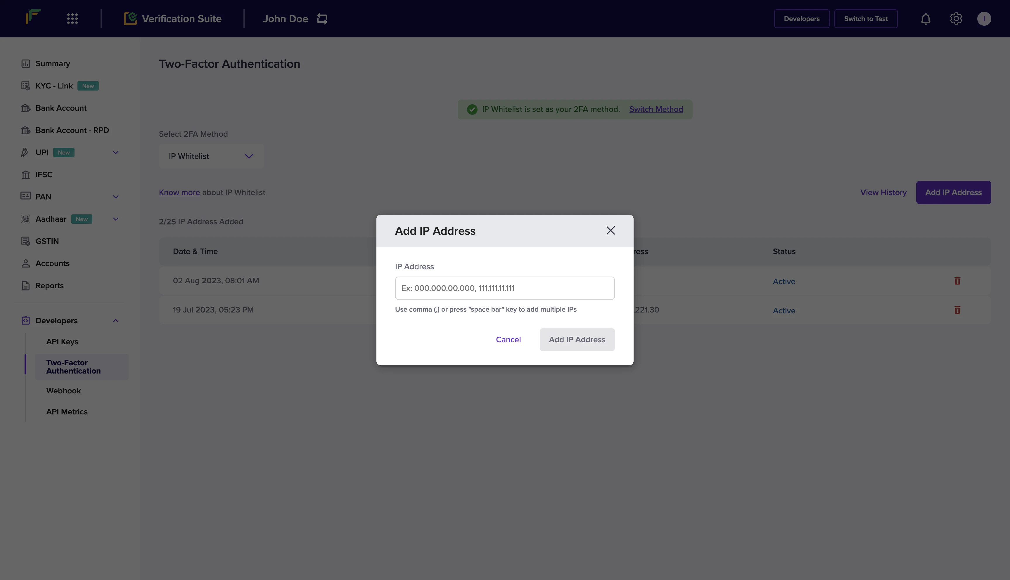 Whitelisting the IP address or generating a public key provides a layer of authentication. These cybersecurity techniques prevent anonymous or unknown disbursement requests and allow only verified requests. Your IP address needs to be whitelisted in the Cashfree Payments production server or it rejects all incoming requests. Follow the instructions below to whitelist your IP:- Log in to your Secure ID dashboard and click Developers from the navigation pane > Two-Factor Authentication from the Secure ID card.