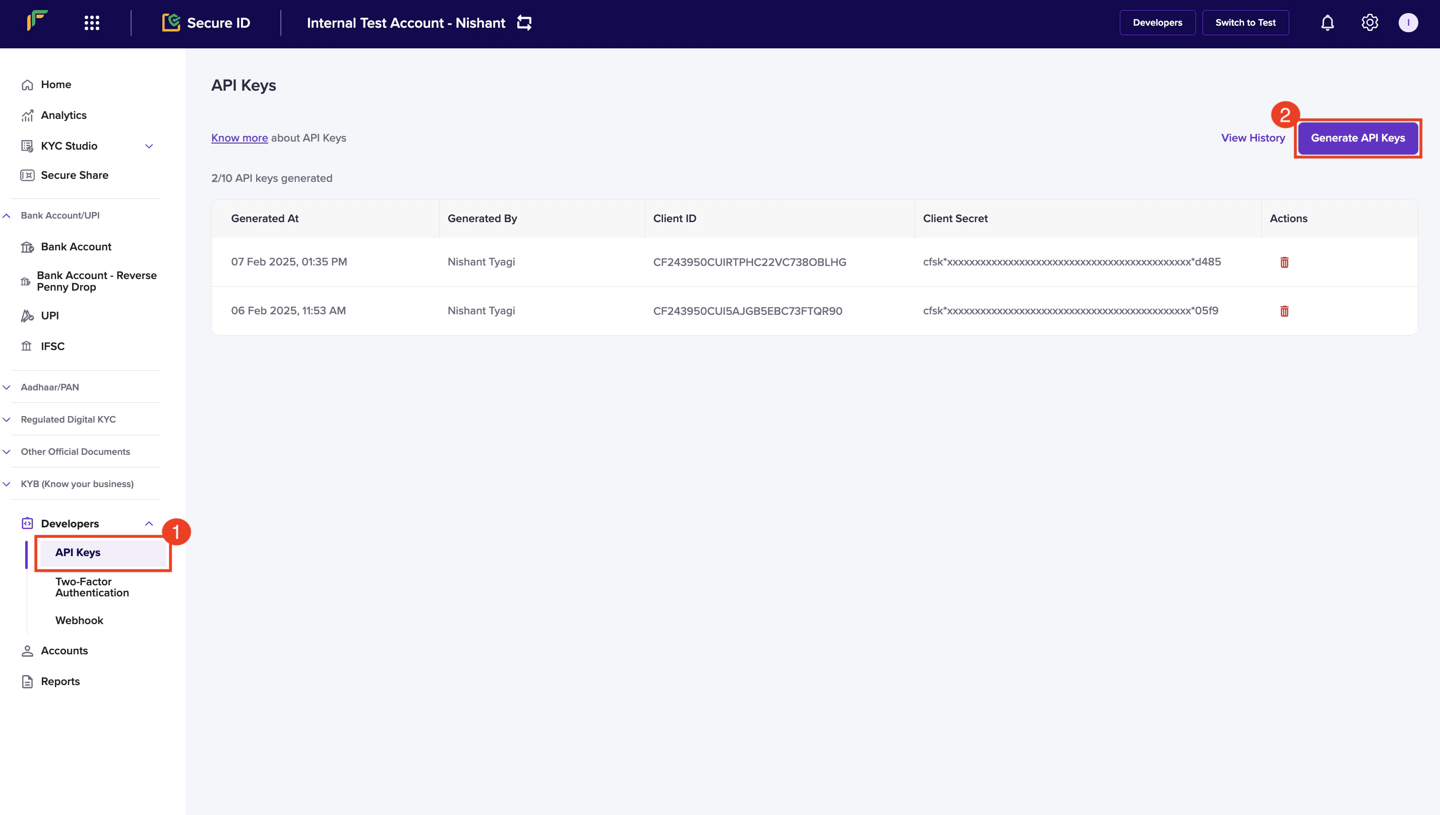 Follow the instructions below to generate API keys:- Log in to your Secure ID dashboard and click Developers on the navigation panel.