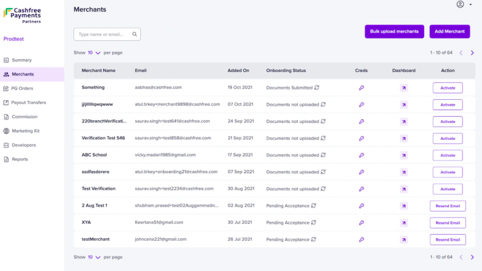 If the merchants did not verify their email ID, you can resend the verification email to them by clicking Resend Email.