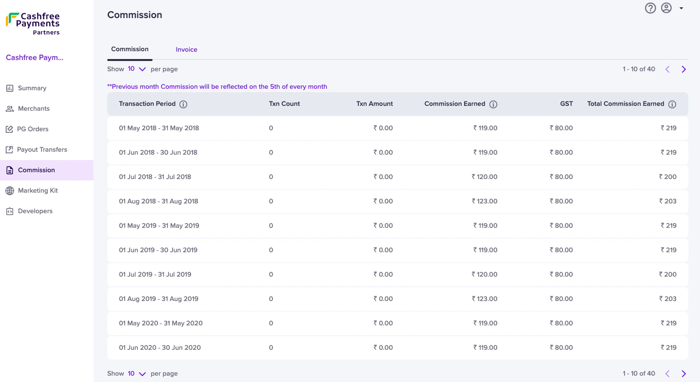 If you are GST registered and shared the GSTIN details with Cashfree Payments, you will see the GST component in the Commission section. This information is not visible to the unregistered partnerss. All GST-registered partners must share their GSTIN with Cashfree Payments as per compliance requirements. Fill out the Support Form to update your GST details.