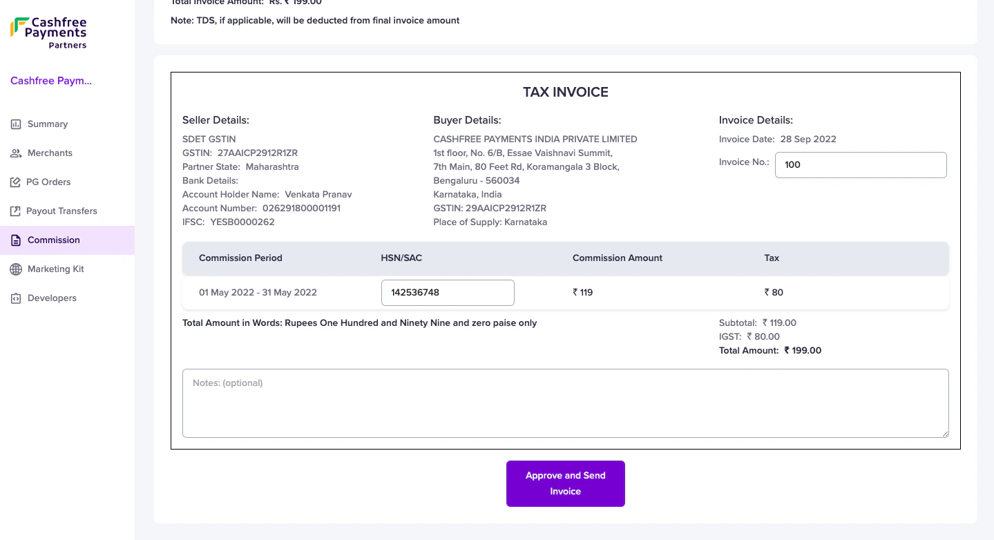 - Upload or generate the invoice and enter the mandatory details. Click Approve and Send Invoice to send the invoice to Cashfree Payments for further processing of the commission amount.