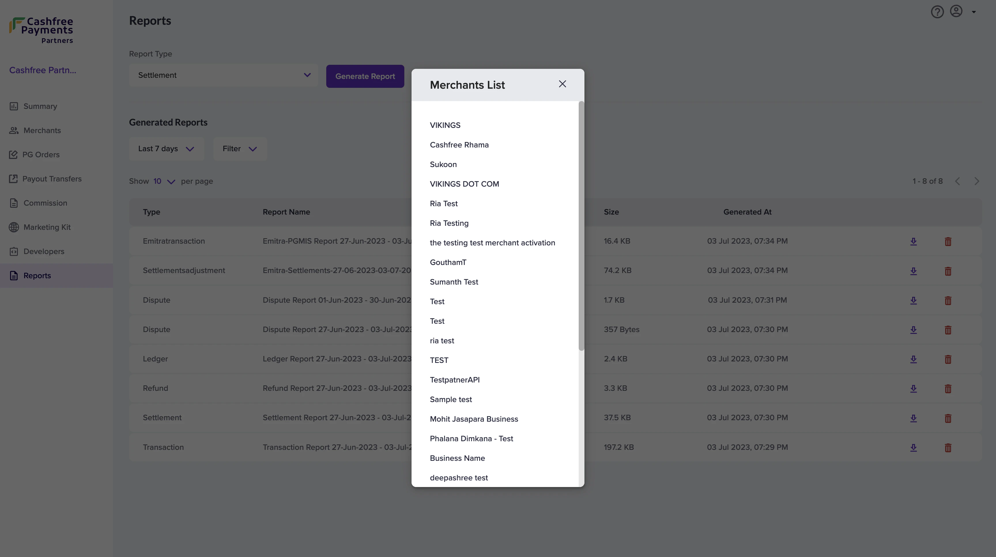 The Summary screen gives you details about your daily transactions, like the current-day transaction count, the value of the transactions made by your merchants, and the last commission amount you received from Cashfree Payments as per the referral program. The following details are available on this page -- Number of Transactions Today - Total number of PG and Payout transactions done by your merchants.