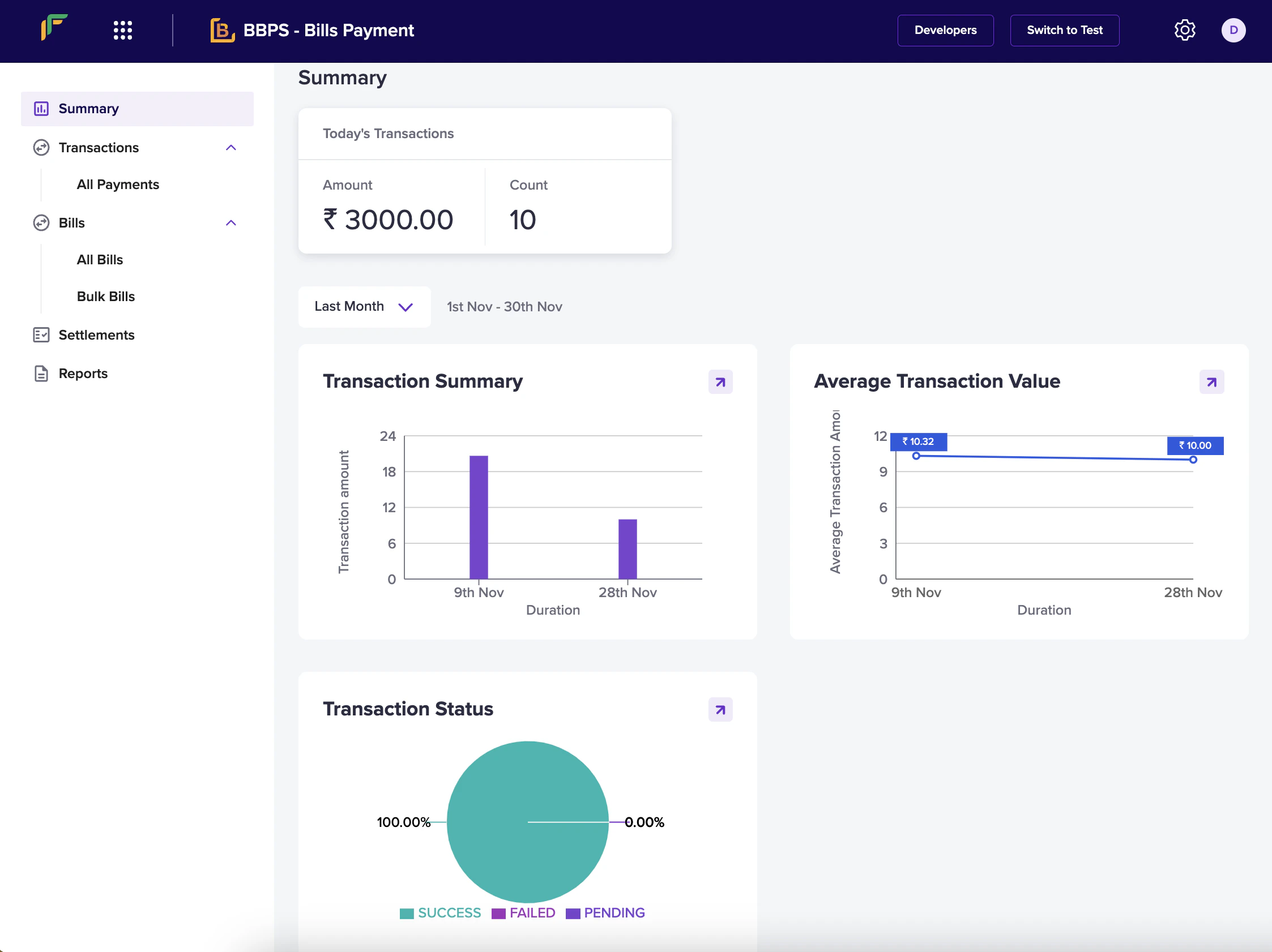 - Average Transaction Value - A graphical representation of day wise average transaction value over the time range that is specified in the filter above. Clicking on the arrow mark will redirect you to the Transactions page.