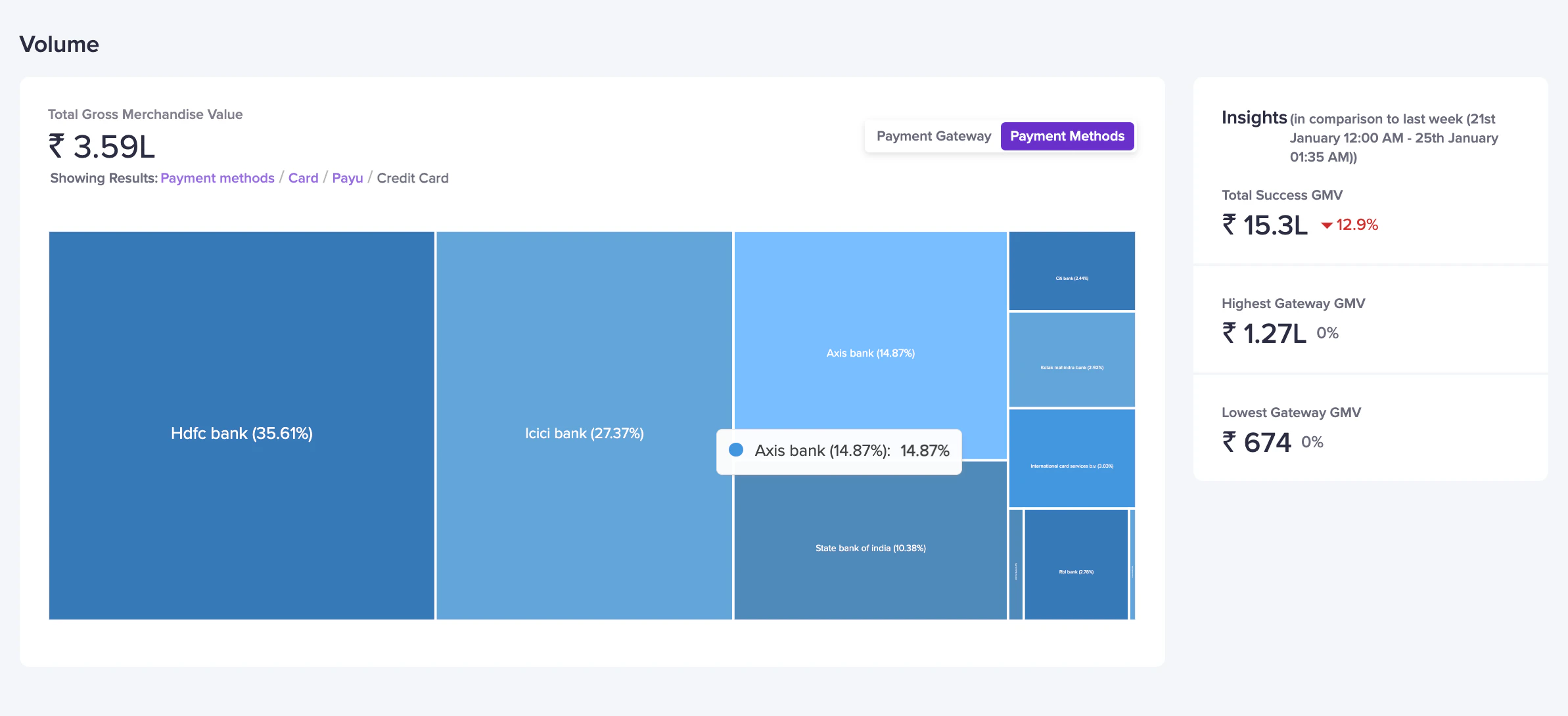Volume Analytics shows how much each payment method contributes to total sales.-