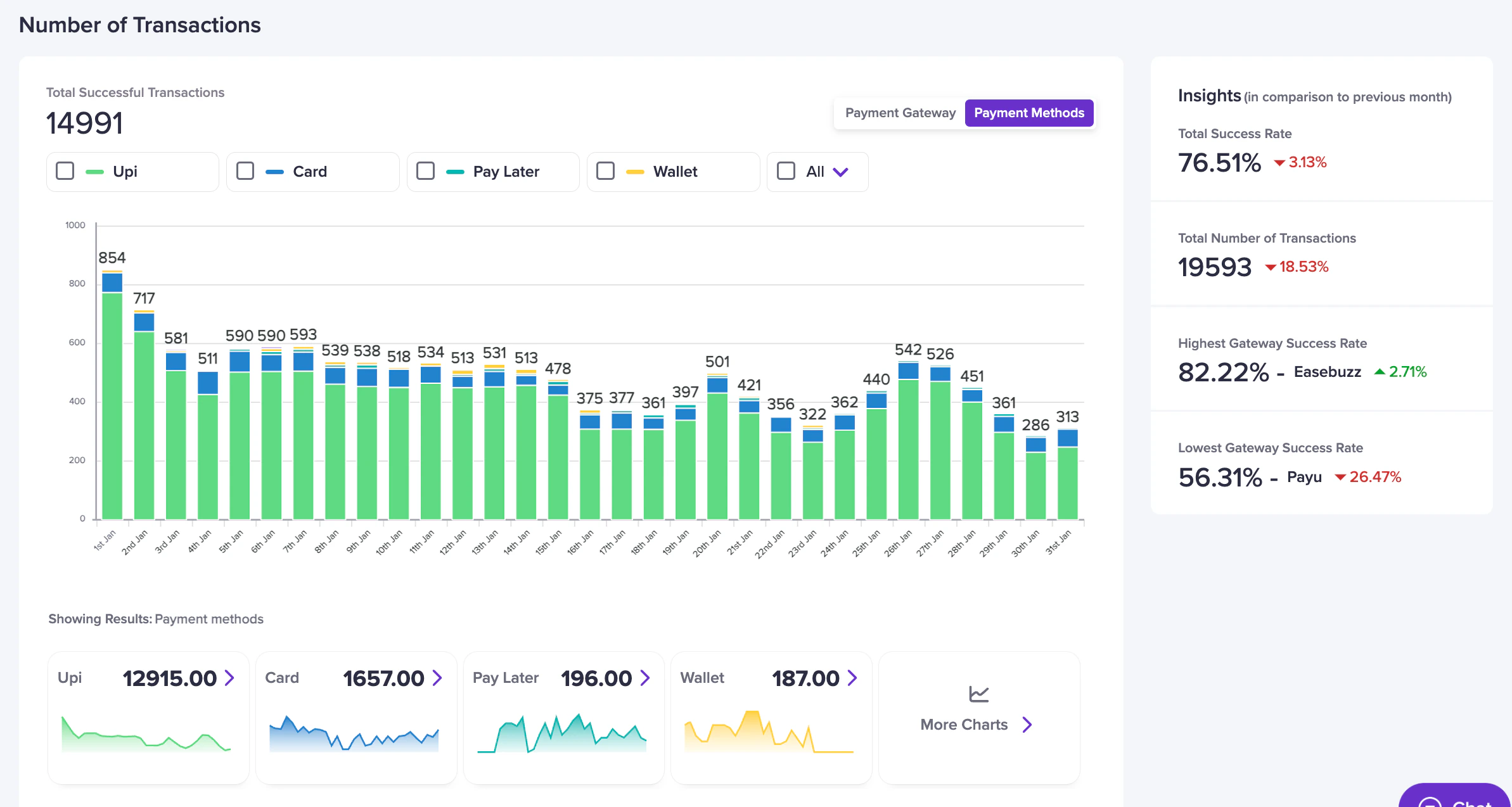 See which payment methods work best (e.g., UPI, card) and identify issues.