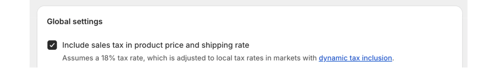 - Scroll to Global settings and select the Include sales tax in product price and shipping rate check box. Click Save.