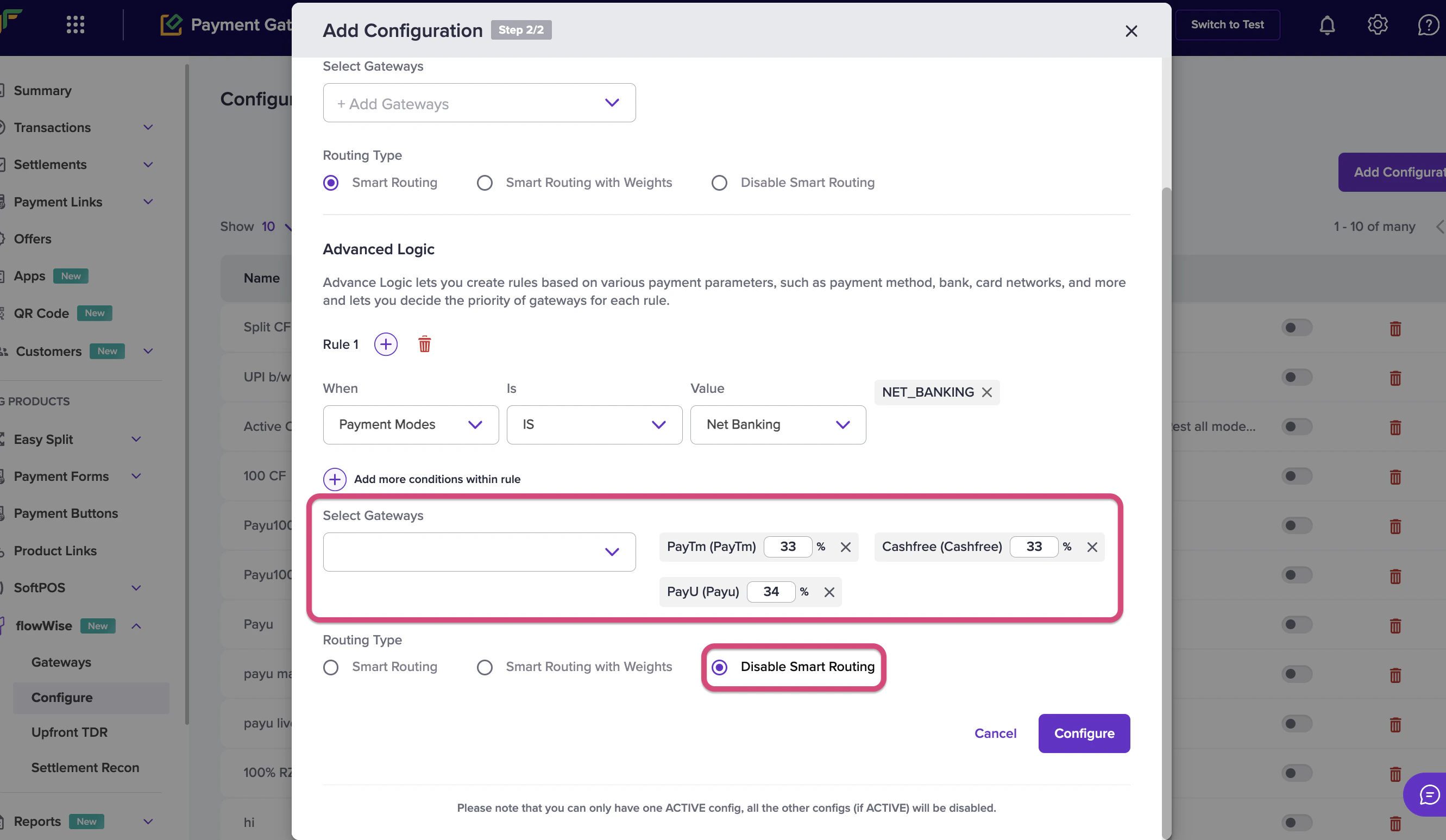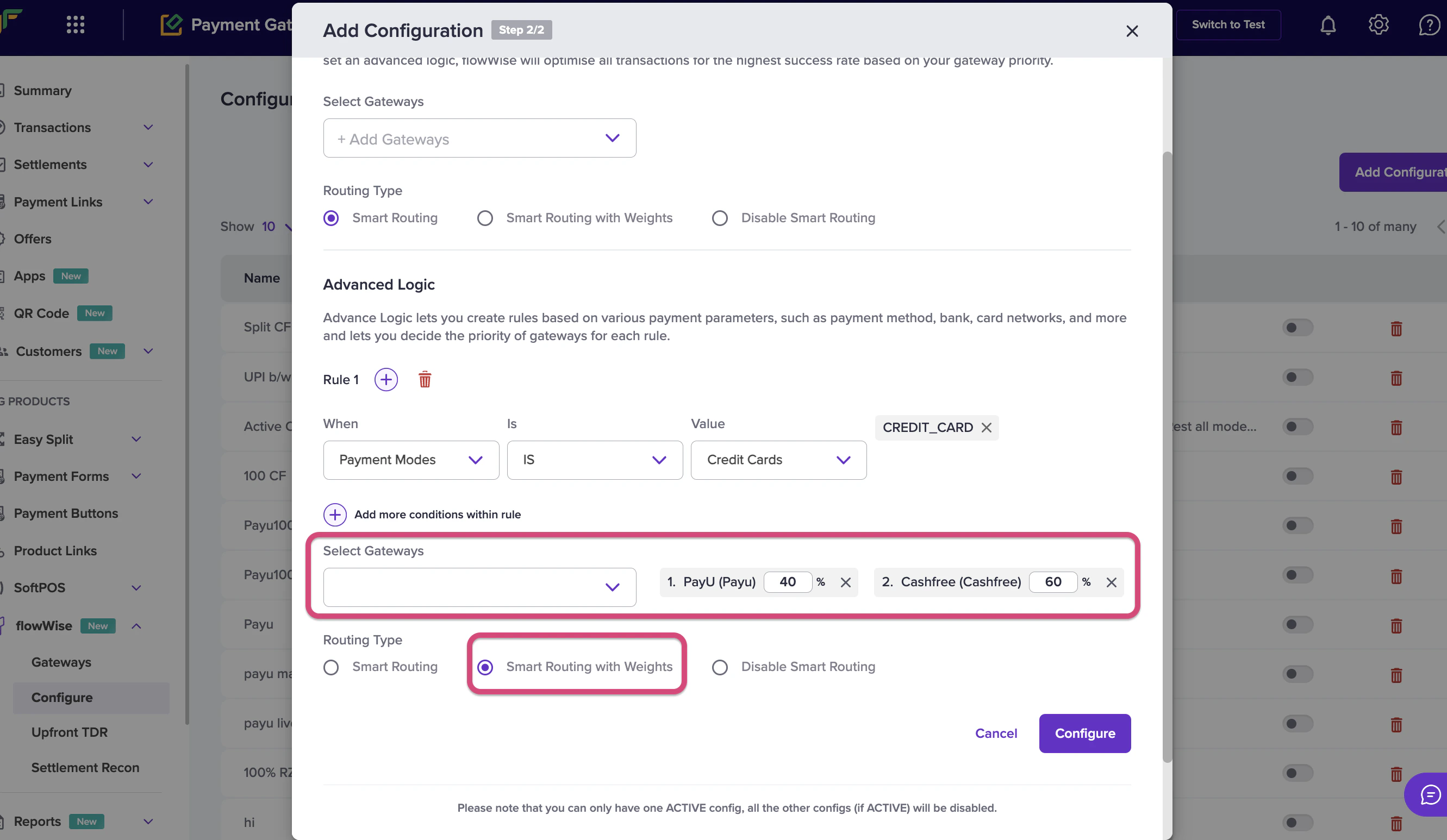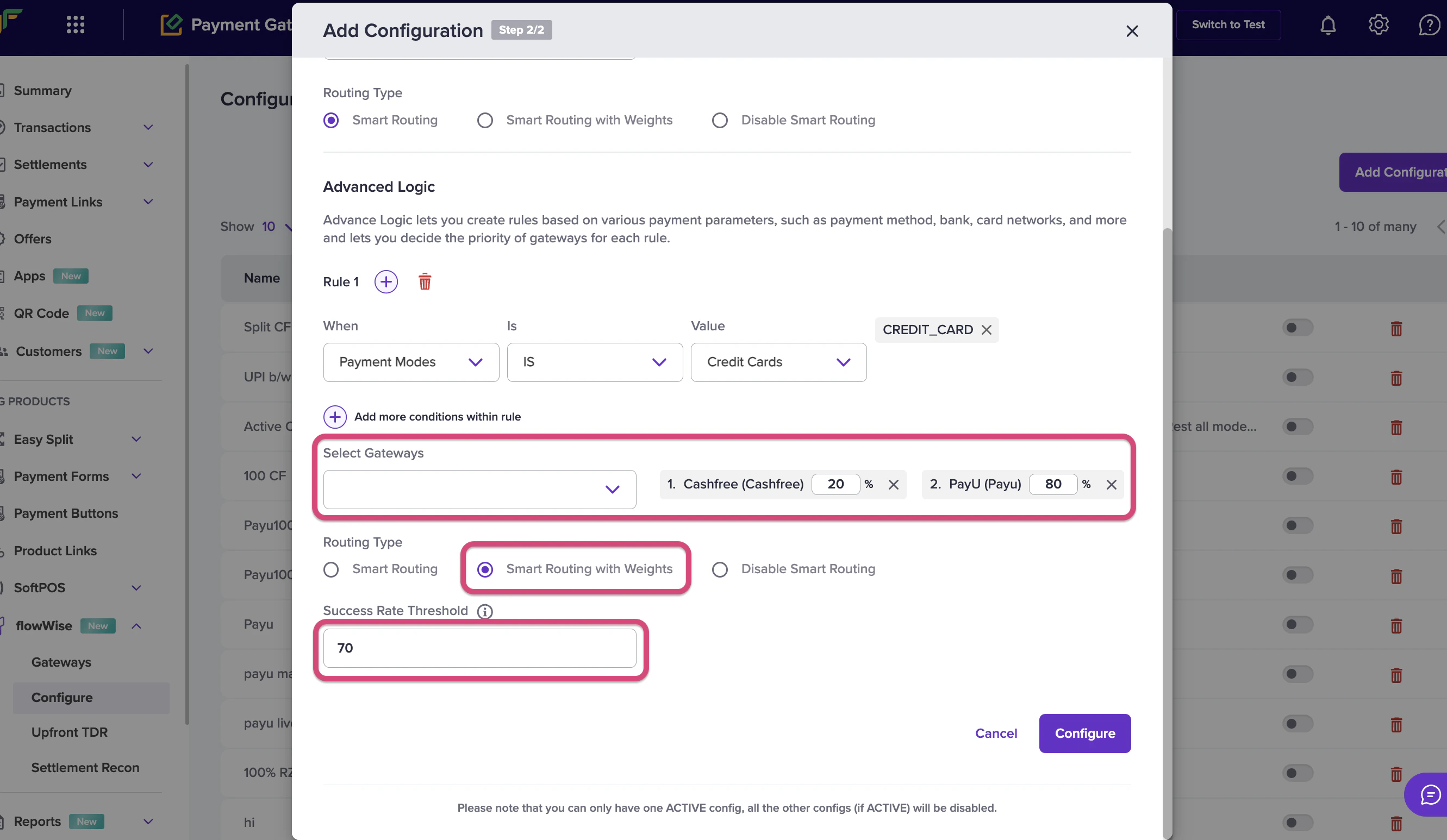 This option allows you to set weighted preferences for each gateway in addition to success rates, optimizing the balance of traffic based on your needs.