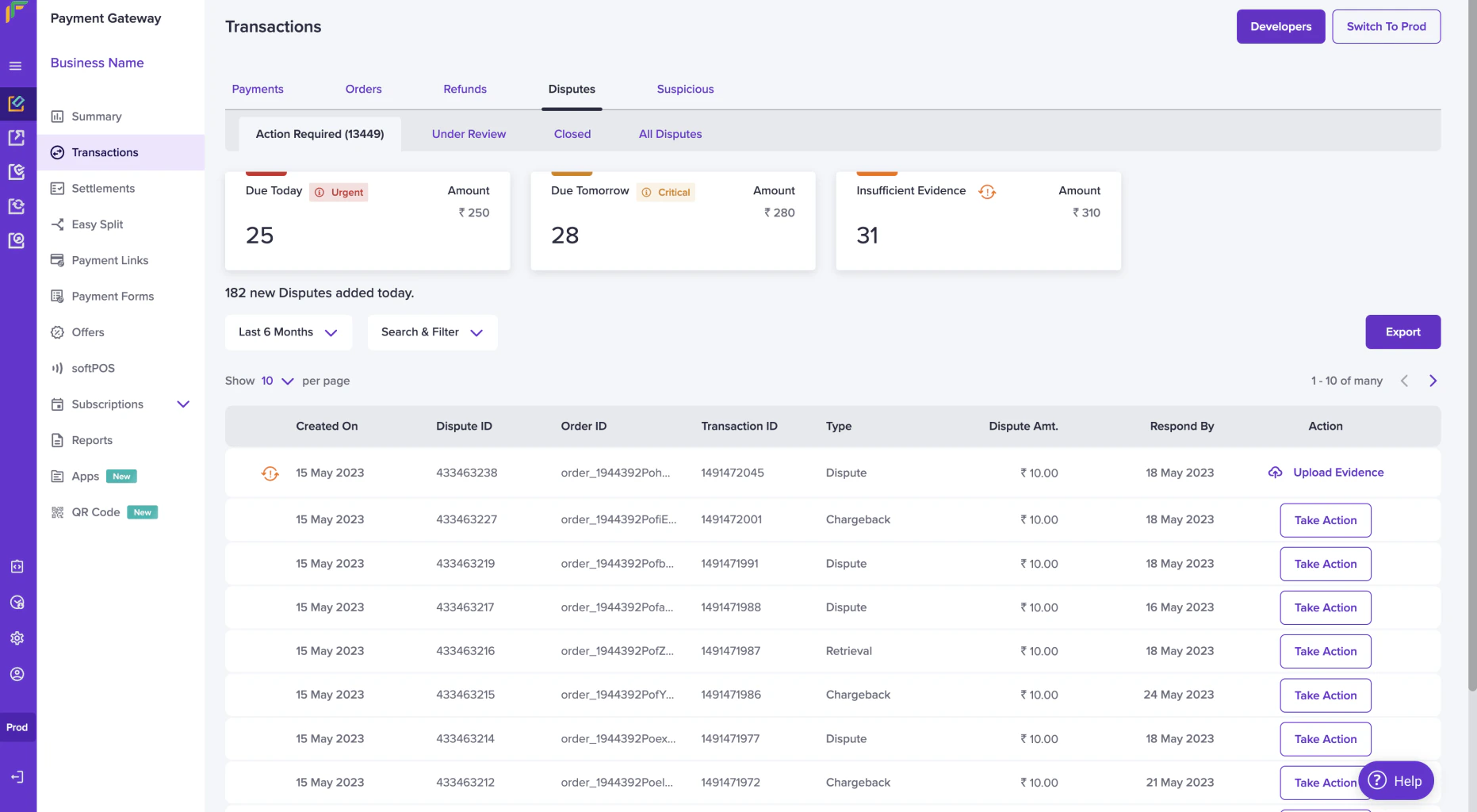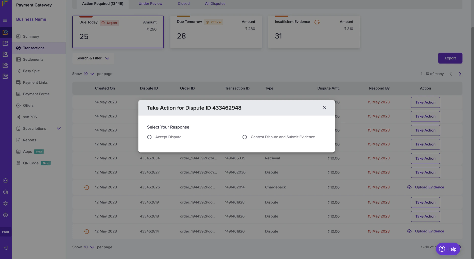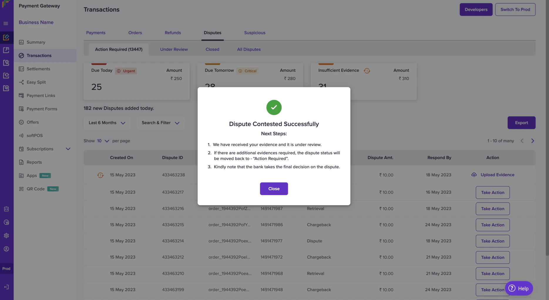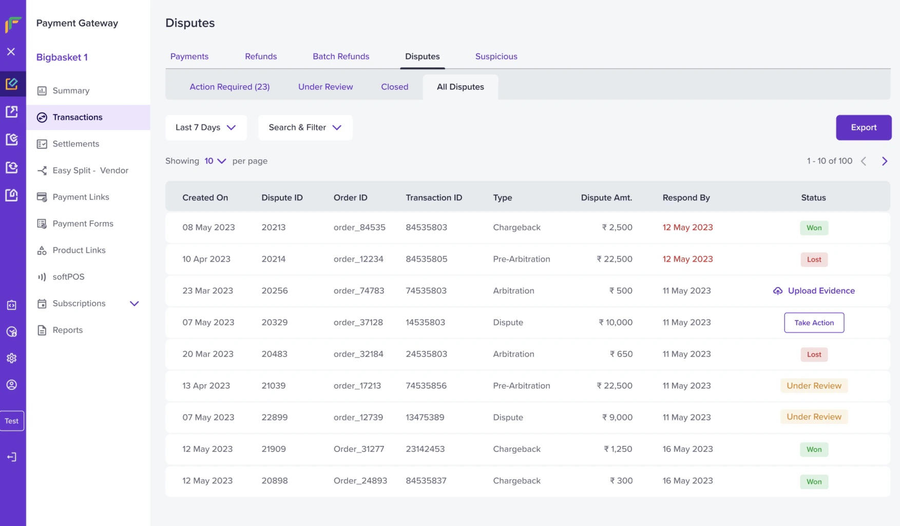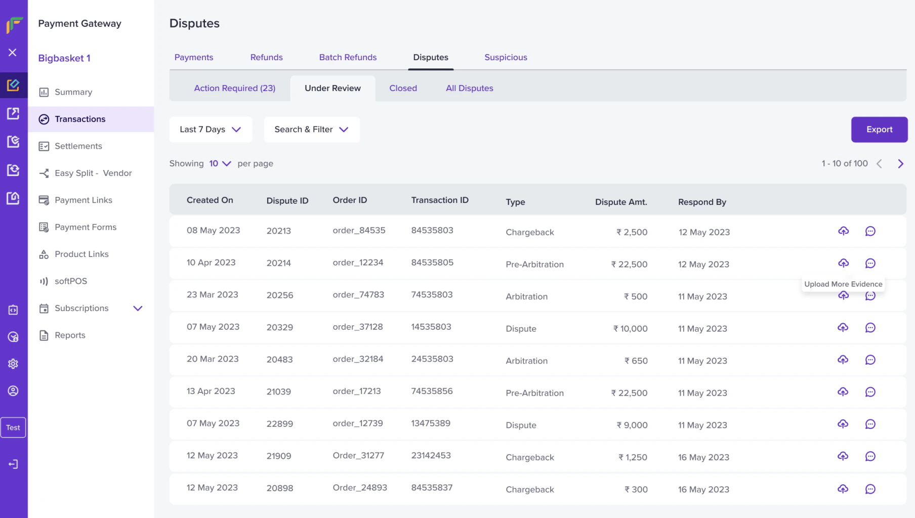 The all dispute section shows all the disputes that are raised by your customer irrespective of the dispute status. You can respond to a dispute or upload further evidence from this section.