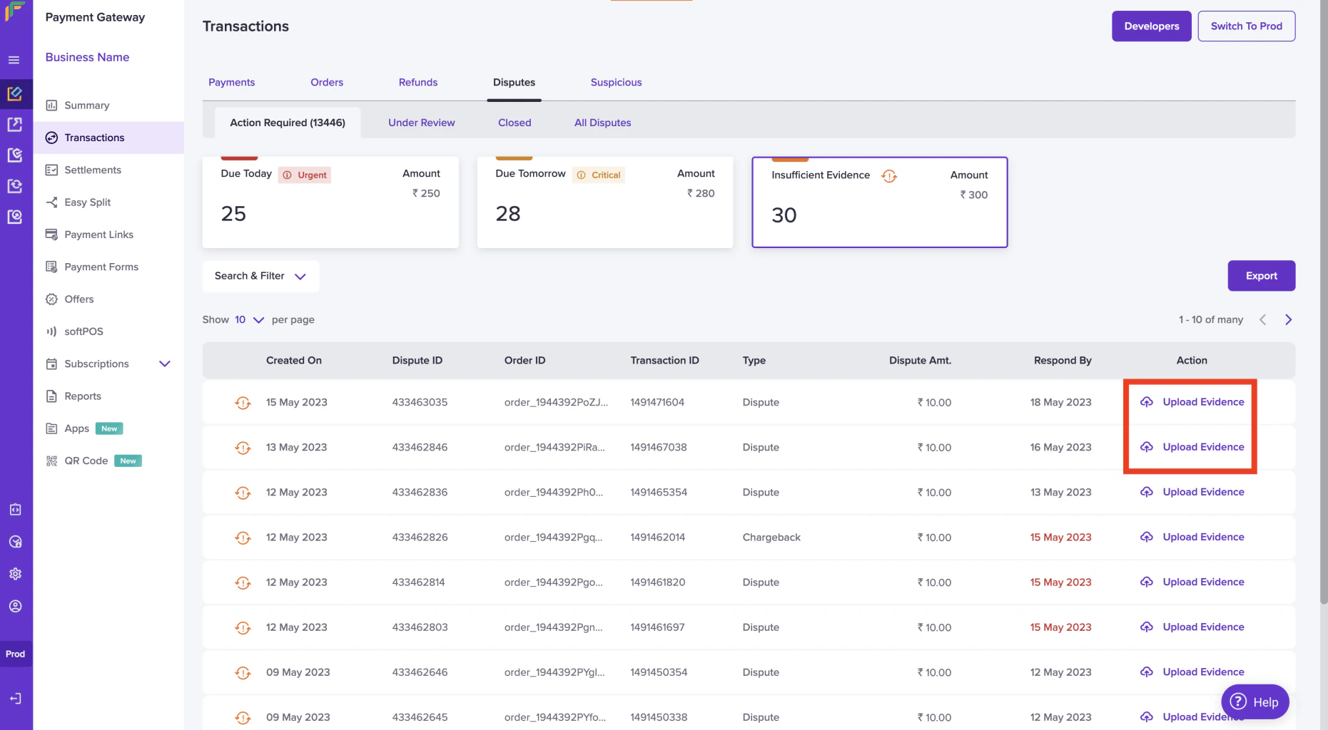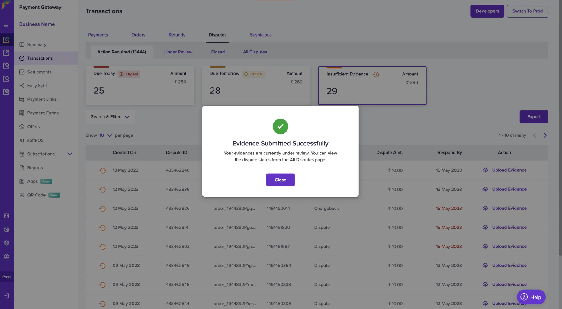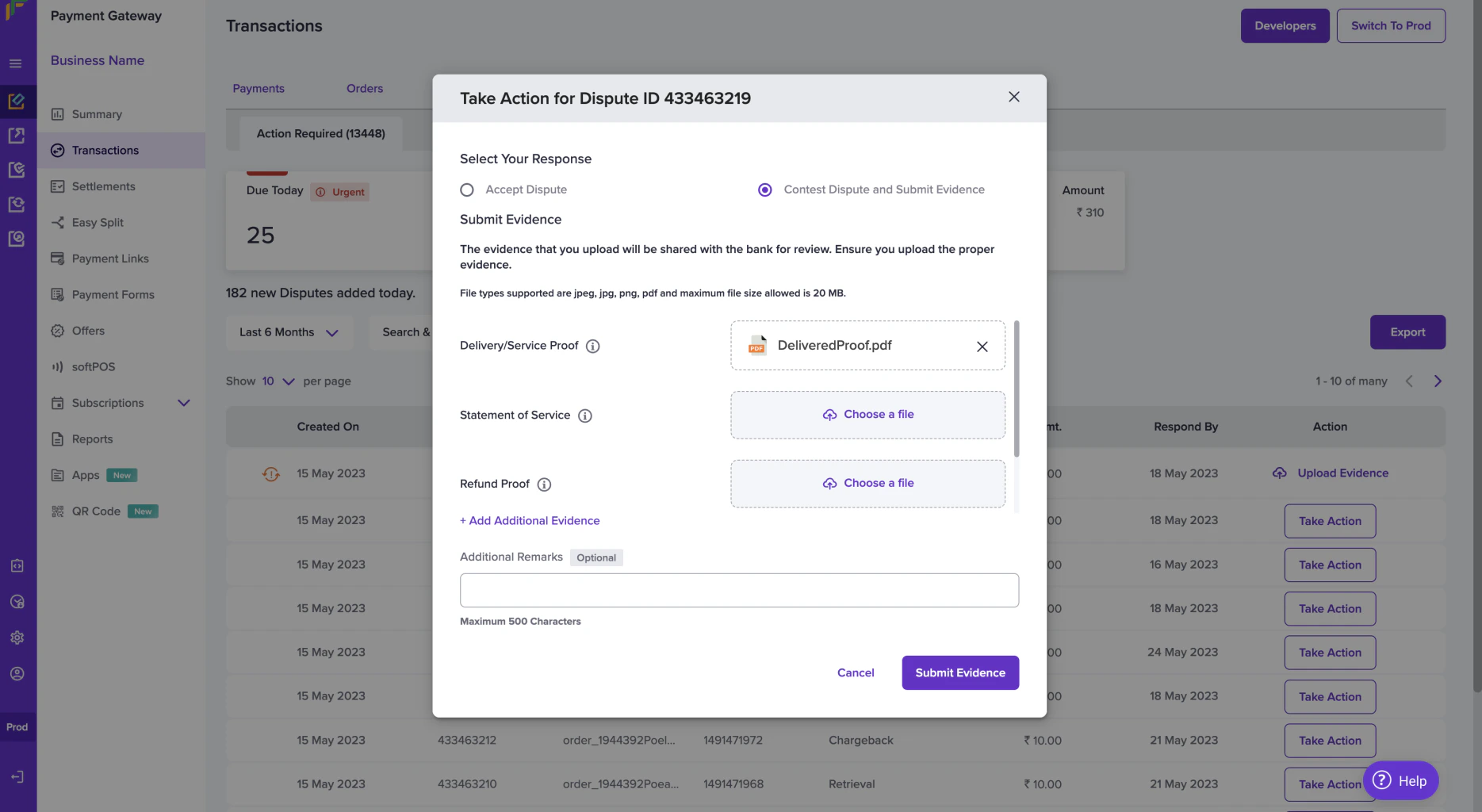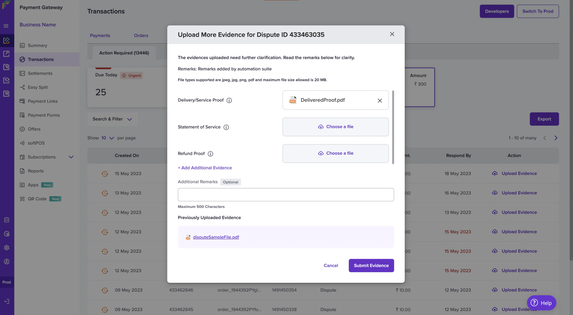 If the evidence you have submitted is insufficient, you will see the Upload Evidence option beside the dispute. Click the Upload Evidence option and upload the required evidence.