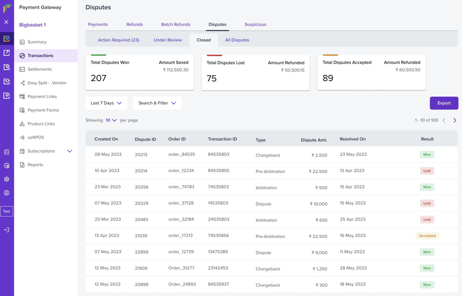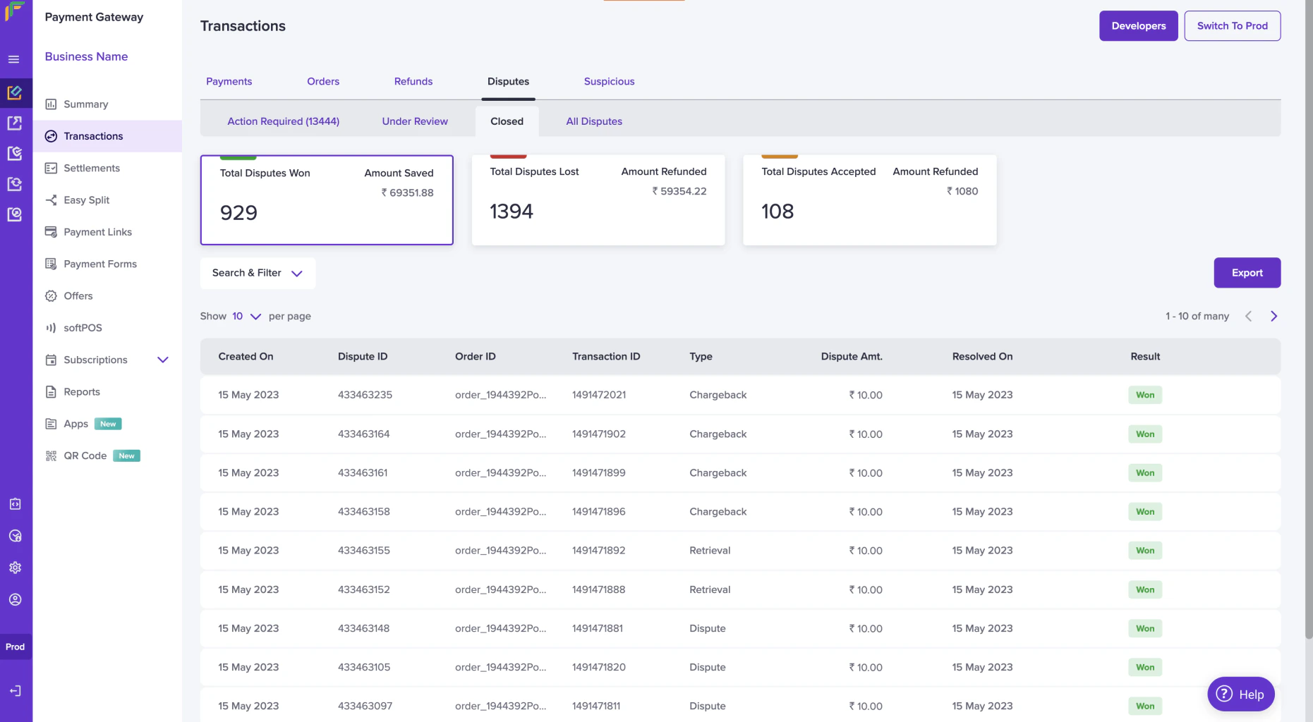 For example, if you click the Total Disputes Won placard, all the disputes that you have won will alone be filtered and displayed.