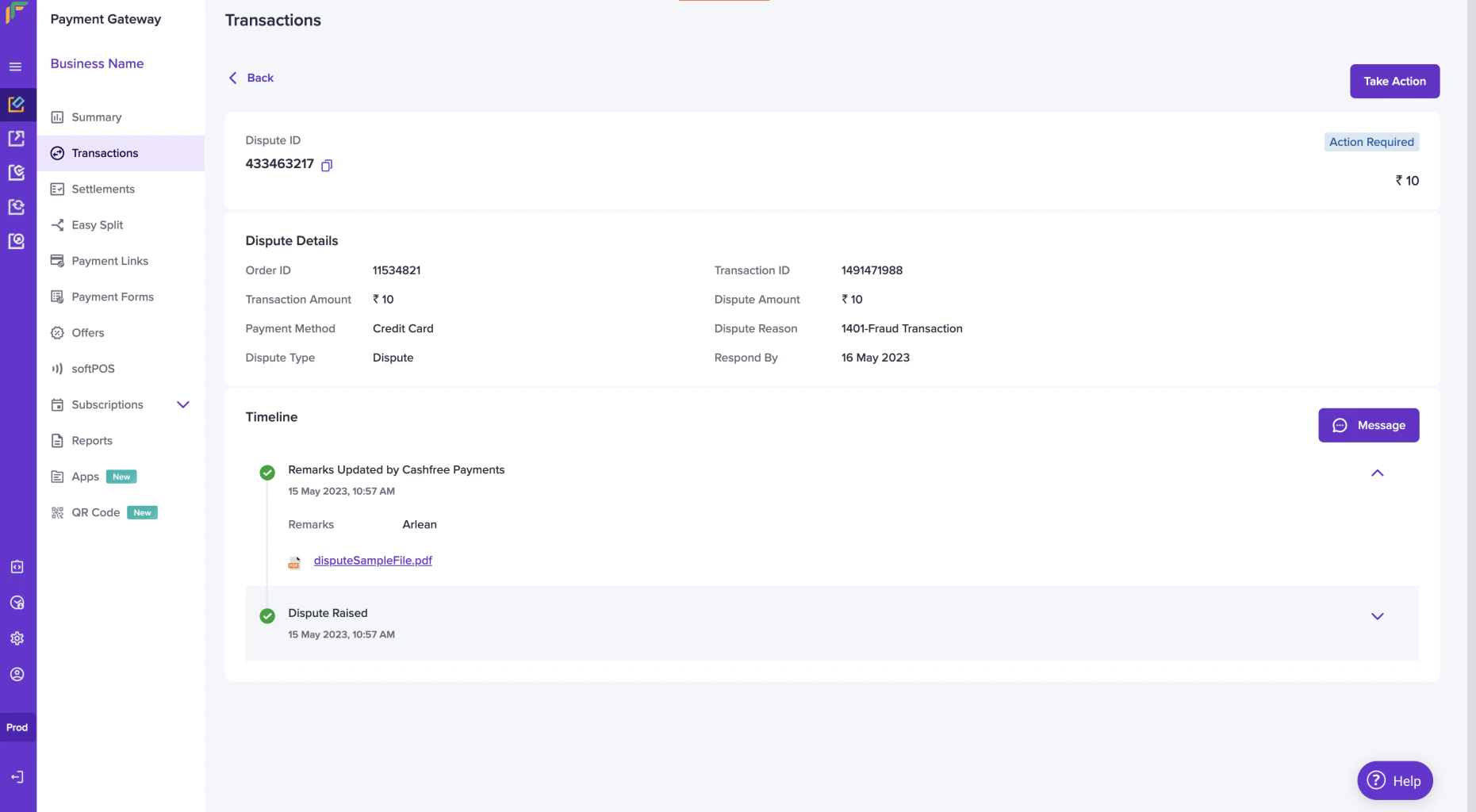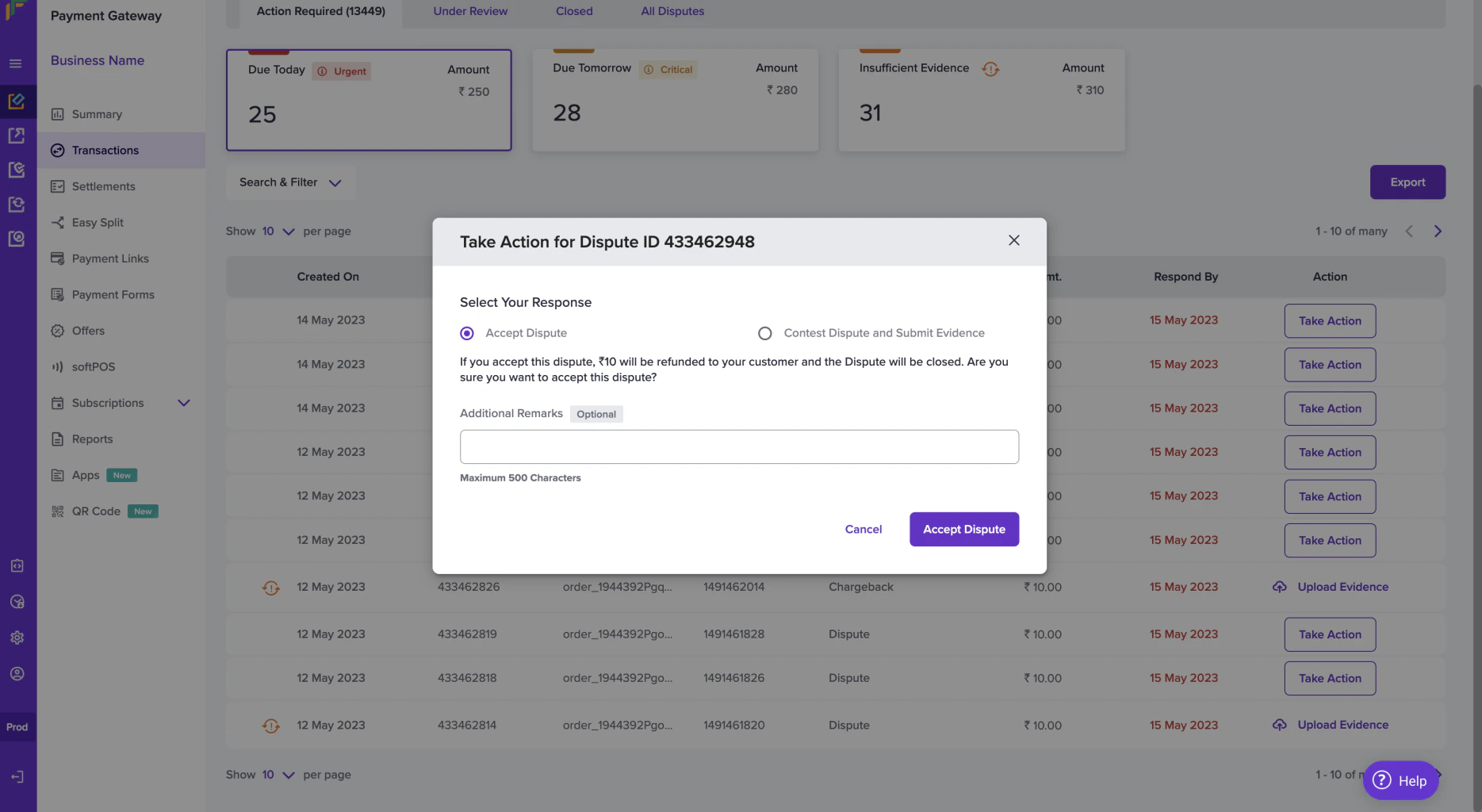 You can accept a dispute if you agree with the claim submitted by customer. To accept a dispute, select the Take Action option. From the Take Action pop-up, select the Accept Dispute option. Add any remarks if needed.