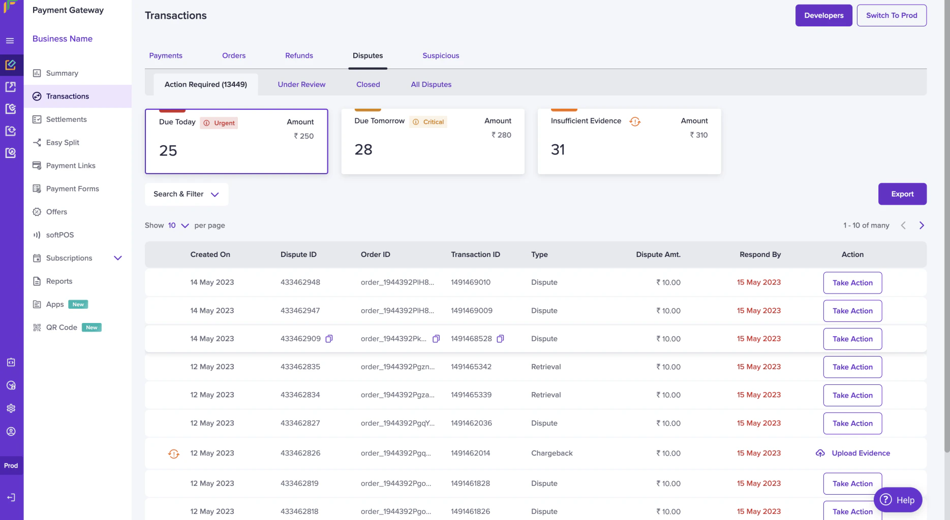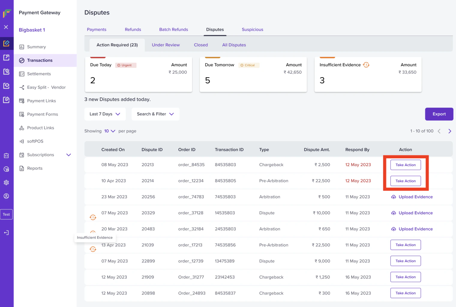The Action Required page lists all the disputes to which you must respond and take action. There are placards that show the disputes that are due today, tomorrow, or if the evidence submitted is insufficient. Apart from this, you have other information such as: