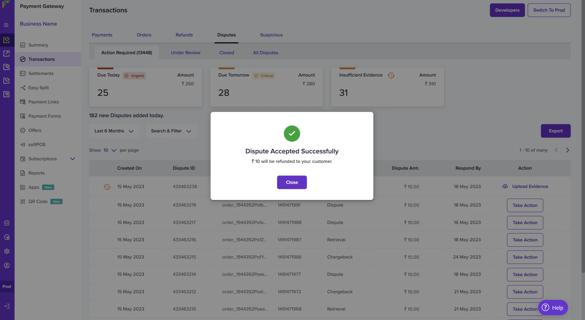 Once you click Accept Dispute you will get a message that you have accepted the dispute successfully along with the refund amount. The amount will be refunded to your customer.