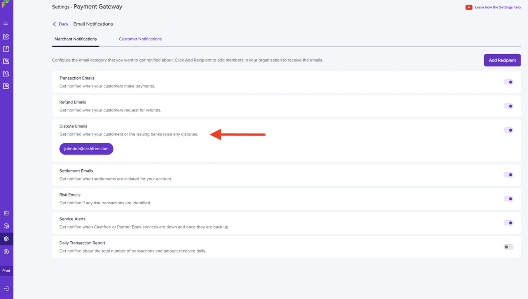 Email notifications can be configured from the merchant dashboard. Emails on which the merchant wants to receive these notifications can be configured from the merchant dashboard by following the below steps: Go to Payment Gateway Dashboard > Settings > Email Notifications > Dispute Emails.