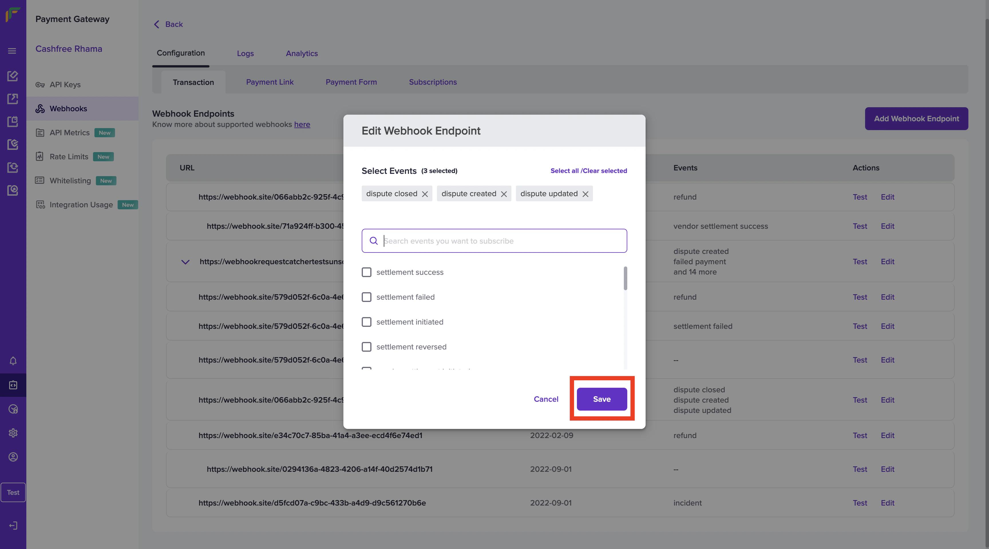 You also have the option of editing a webhook. Click the Edit option on the webhook that is to be edited and select the events you want to add/remove to the webhook. Once done click Save.
