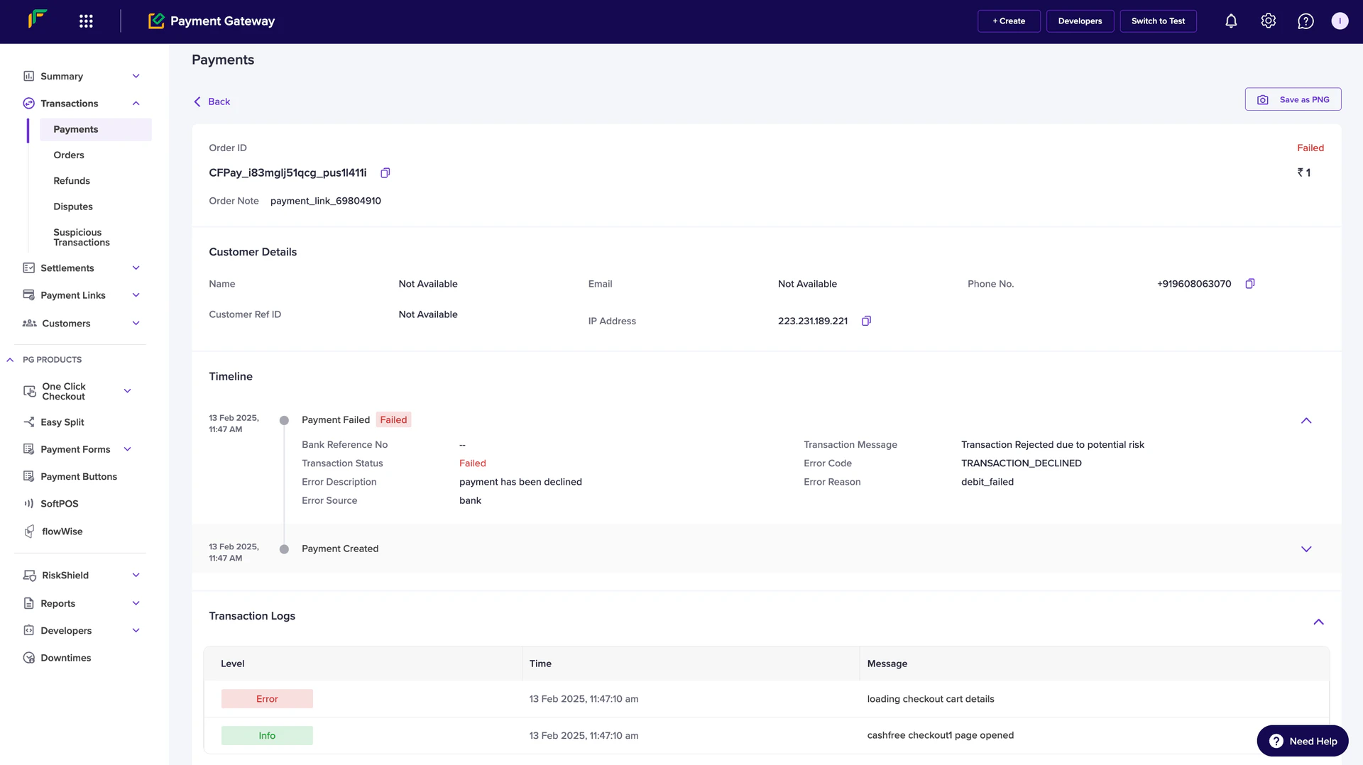 • Transaction Message: A message explaining the reason for transaction rejection, such as Transaction Rejected due to potential risk