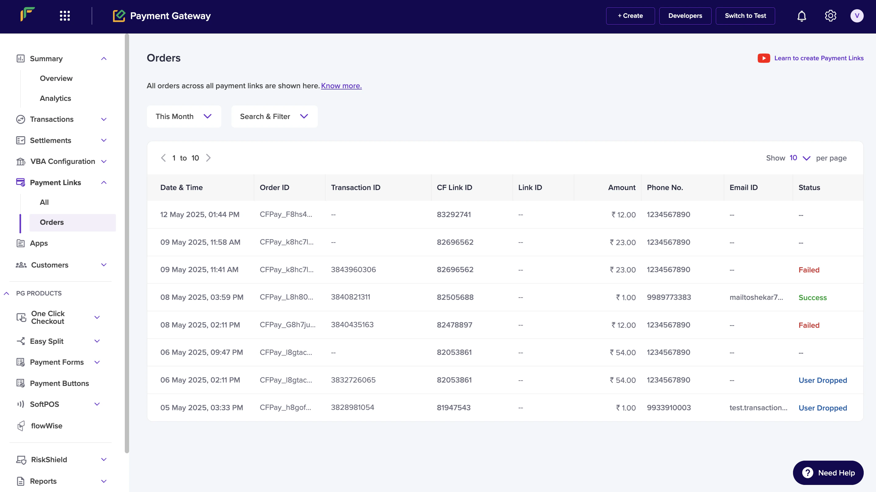 Each time a customer opens a payment link and attempts a payment, a new order is created for that link. This lets you track how many times the customer clicked the link before completing the full payment. You can use this information to follow up with customers and improve your conversion rate. To view order details for a payment link, go to Payment Gateway Dashboard > Payment Links > Orders. You can filter the list by date range. You can also filter by status: Success, Pending, Failed, User Dropped, or Incomplete.