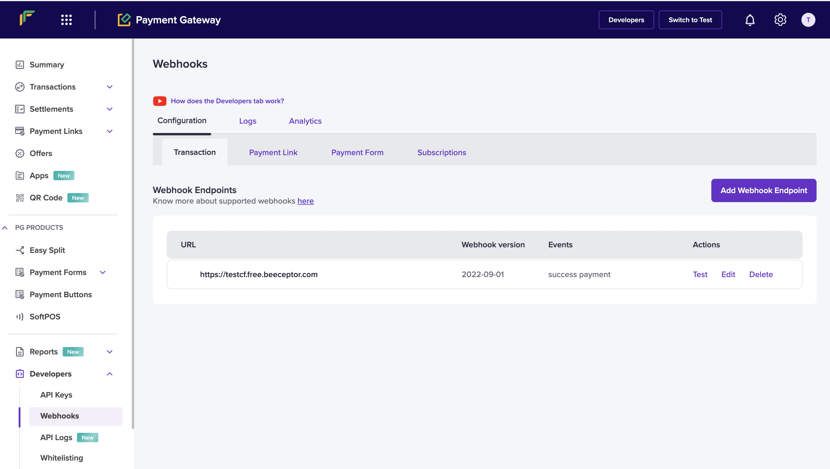 To add a new webhook,- Go to Payment Gateway Dashboard > Developers or click the Developers option from the homepage.