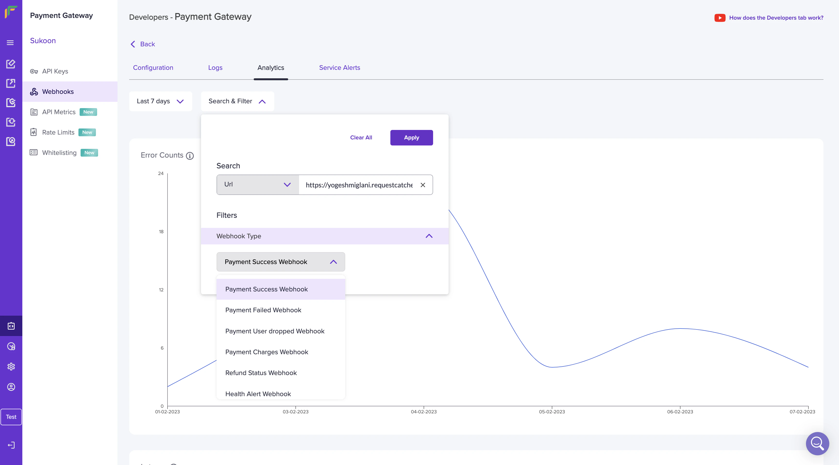 The webhook analytics feature provides you with contextual information on the webhook metrics that allow you to track, monitor, and assess the success or failure of your webhooks. Metrics such as Error Counts and Latency are available. Specify the date range to view the metrics for a particular period. Use the Search & Filter option to view specific logs. Enter the URL and select the required webhook type from the drop-down menu.