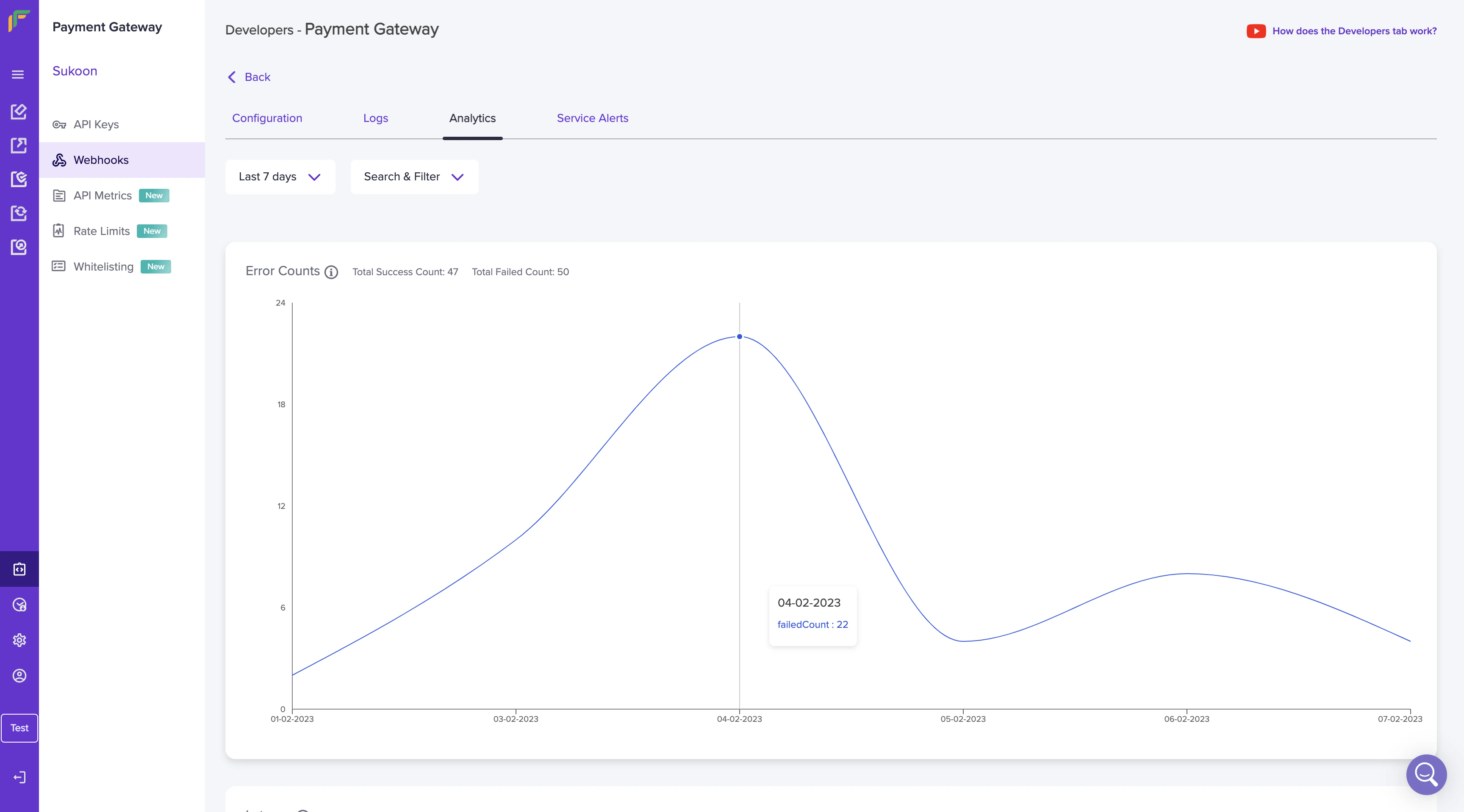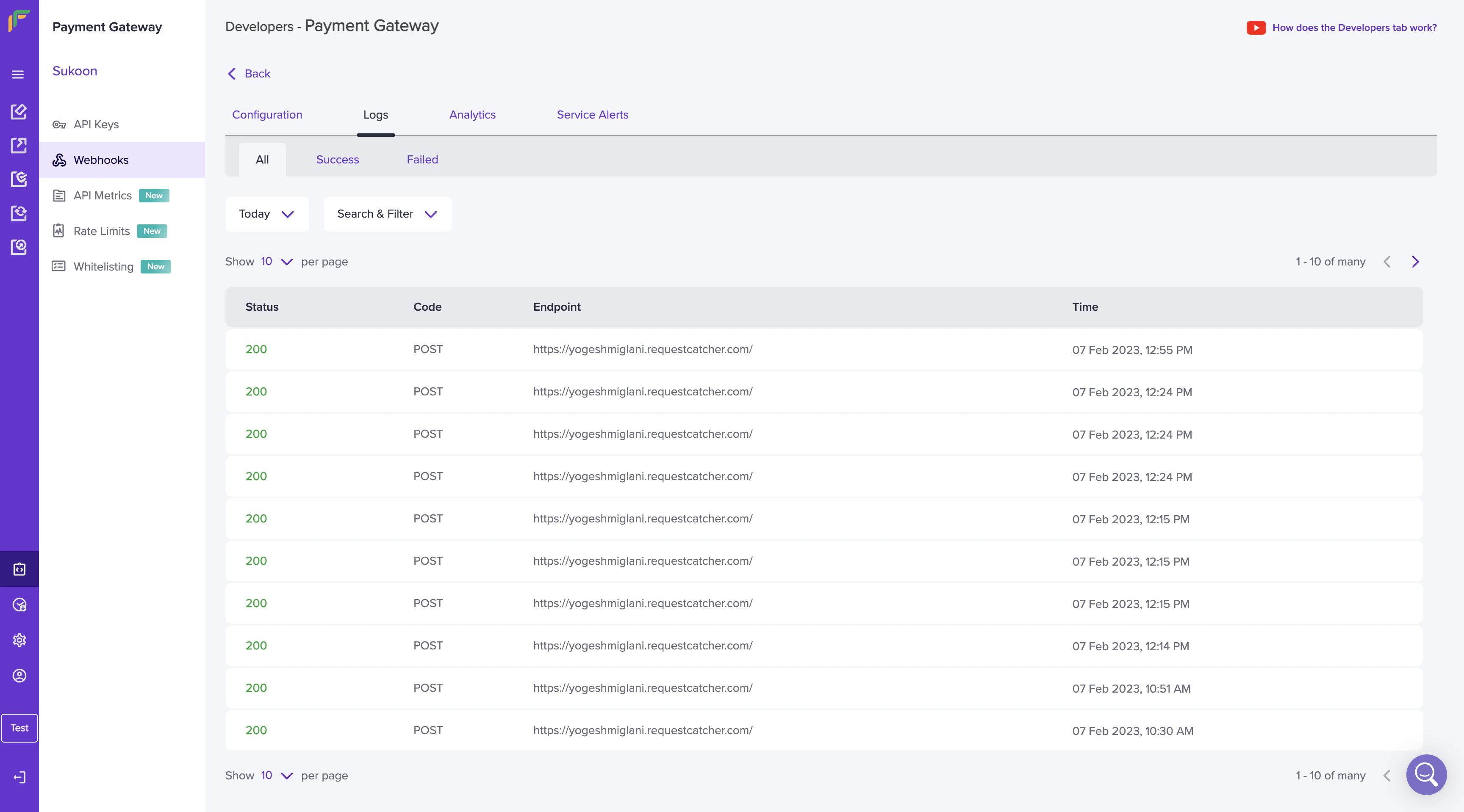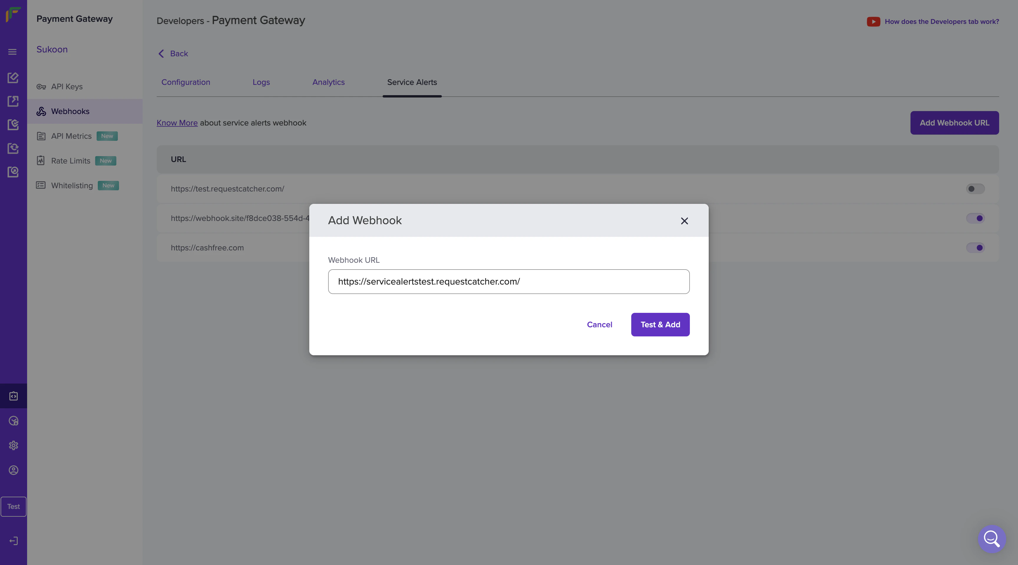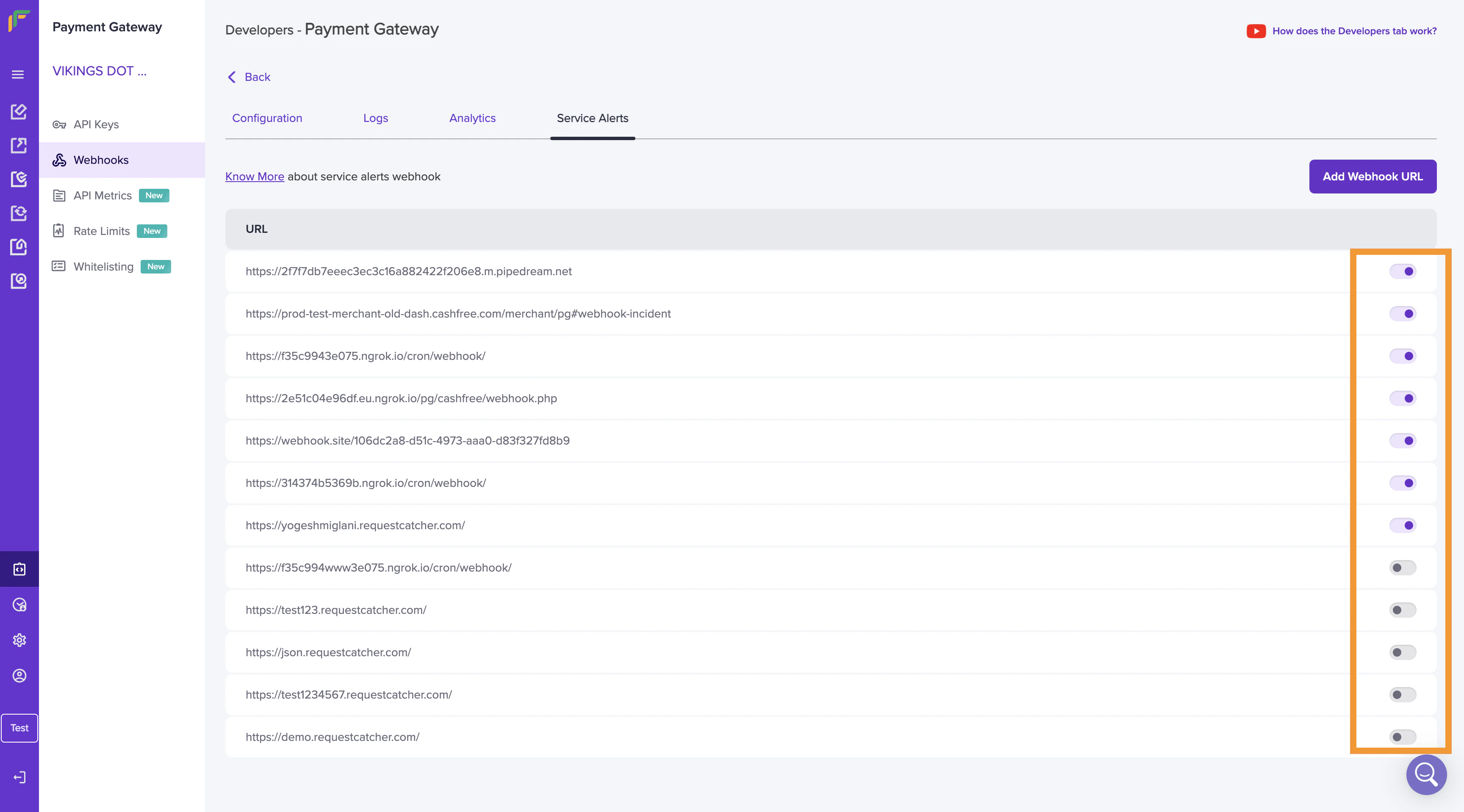 - Go to Payment Gateway Dashboard > Developers > Service Alerts,