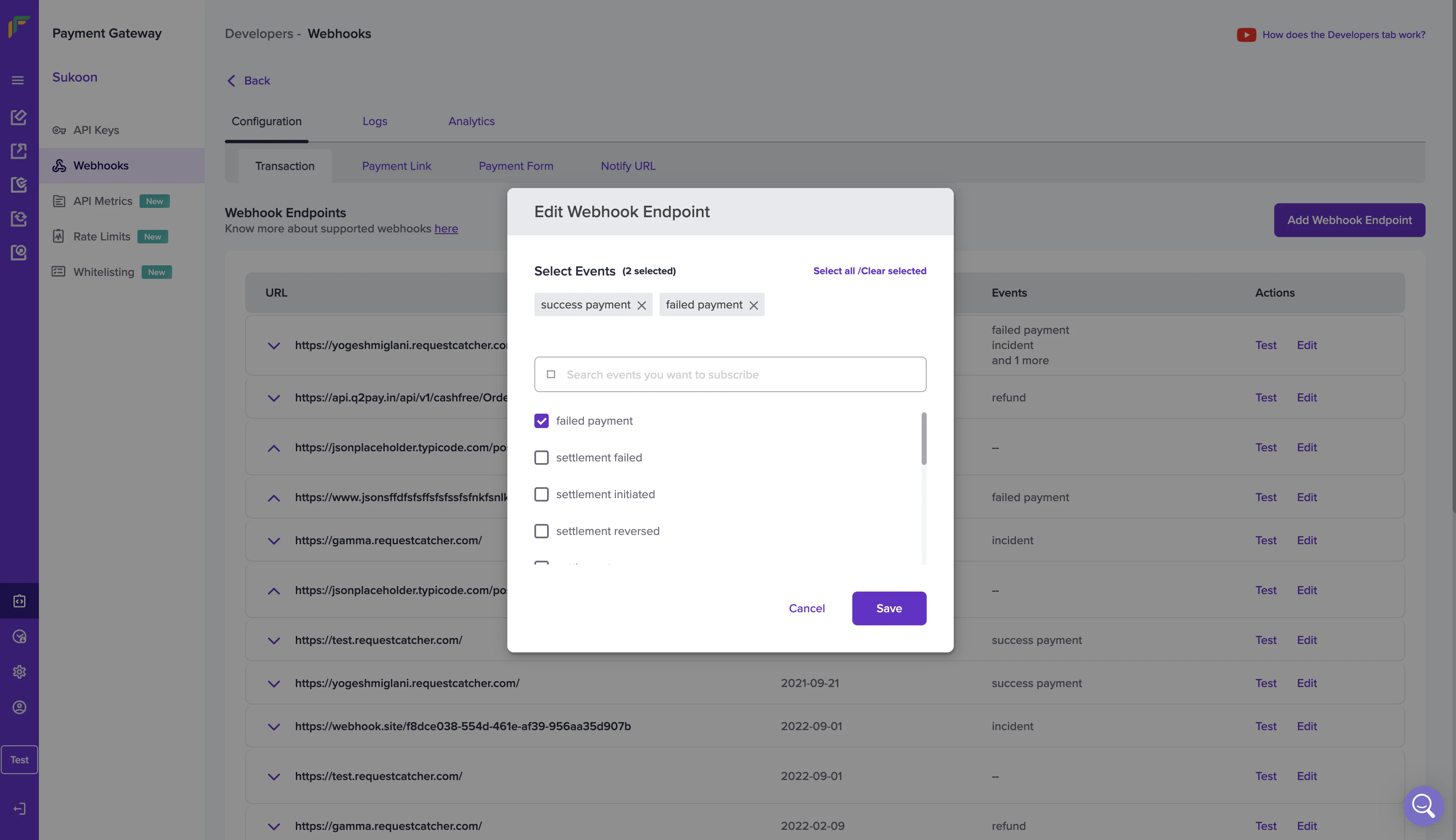 You also have the option of editing a webhook. Click the Edit option on the webhook that is to be edited and select the events you want to add/remove to the webhook. Once done click Save.