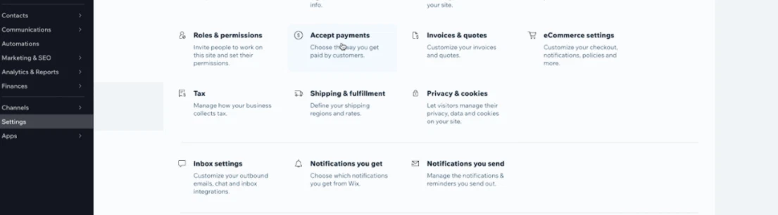 To integrate Wix with Cashfree Payments,- Log in to your Wix account and click Settings.