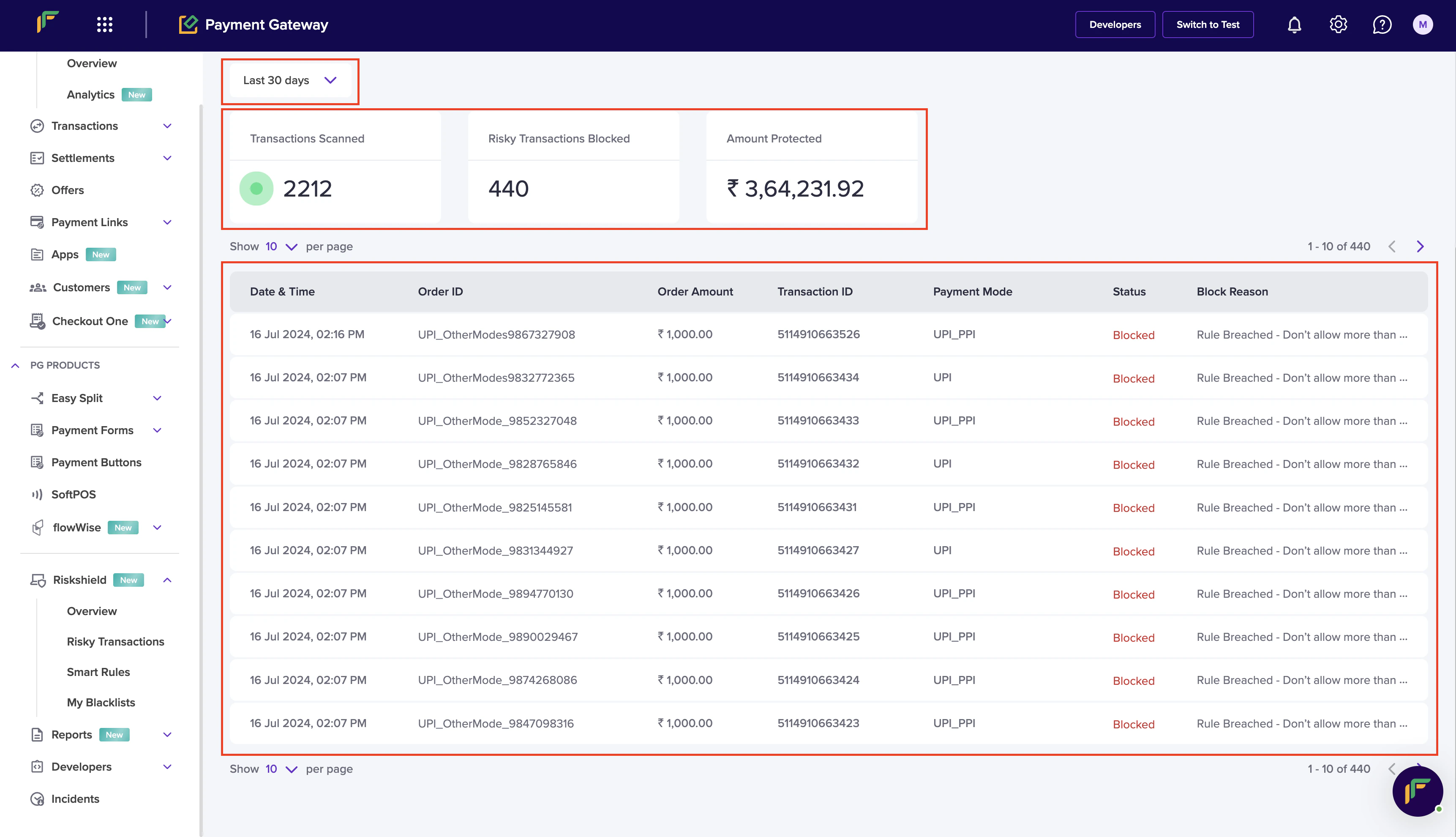 You can view the transactions that we prevent or restrict from being processed. For the transactions under the recommended rule(s), you chose to block appear here. Follow the instructions below to view the blocked transactions:- Navigate to Riskshield > Risky Transactions > Blocked Transactions.
