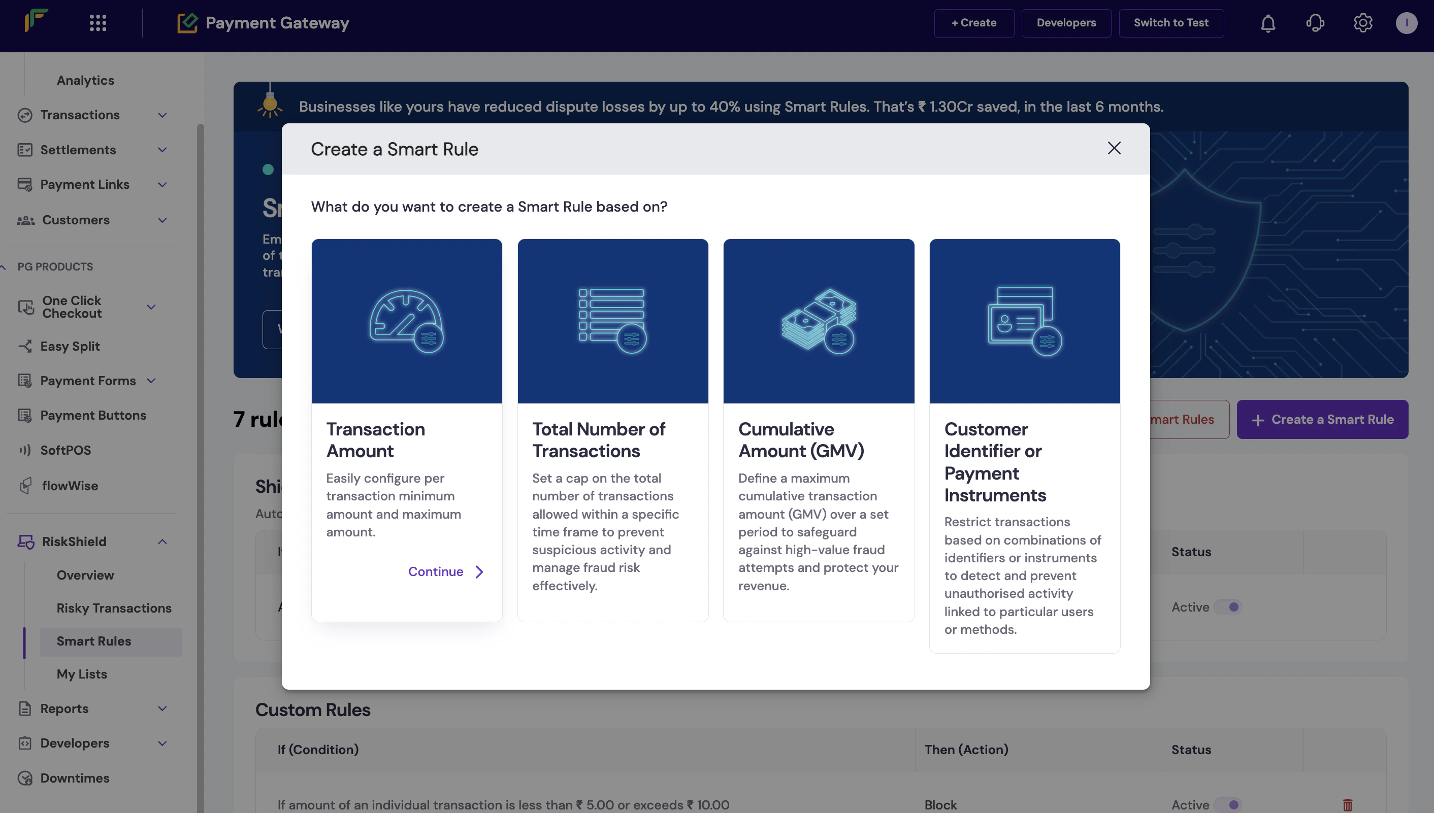 - You can choose to create a smart rule based on the total number of transactions, cumulative amount, or the customer identifier.