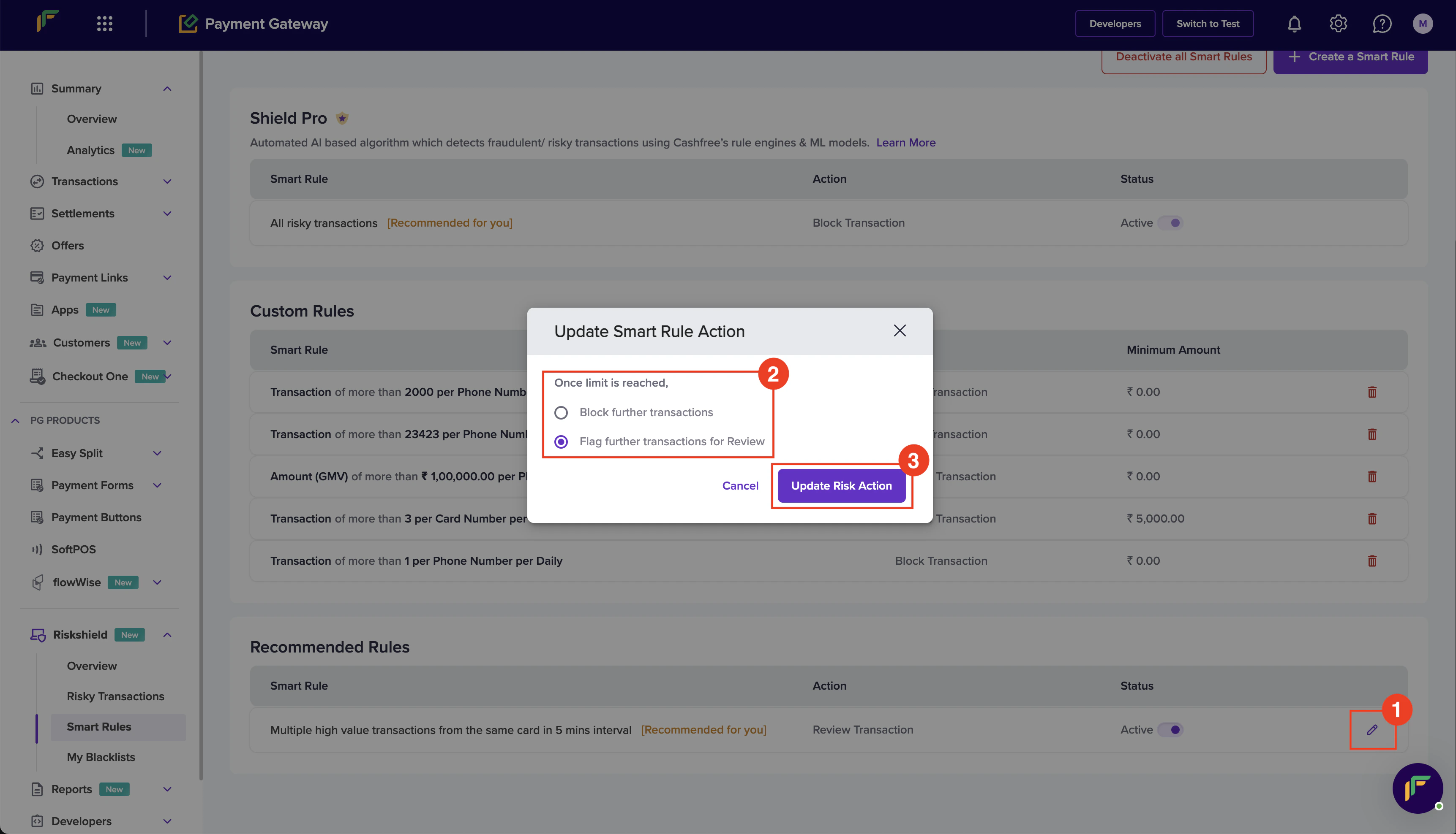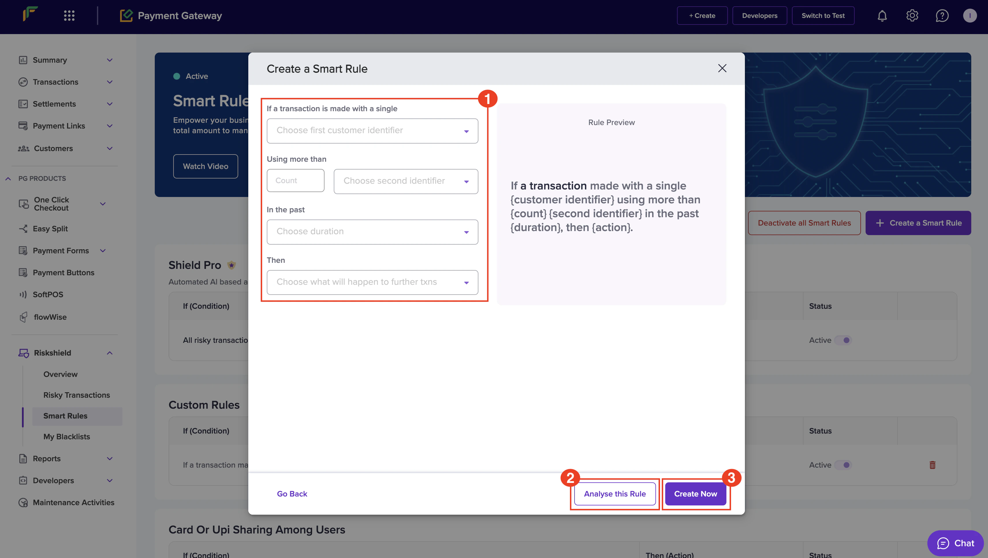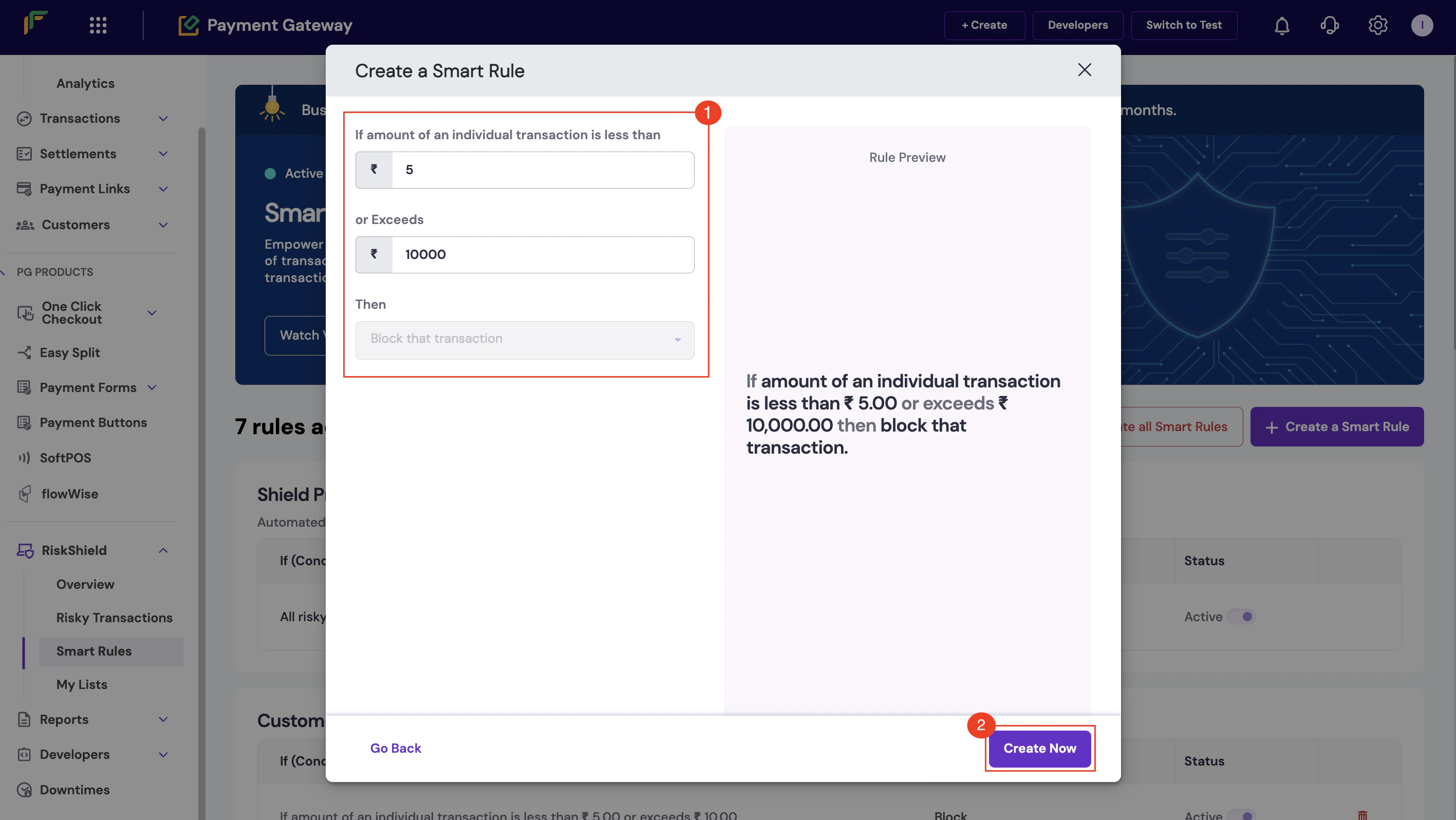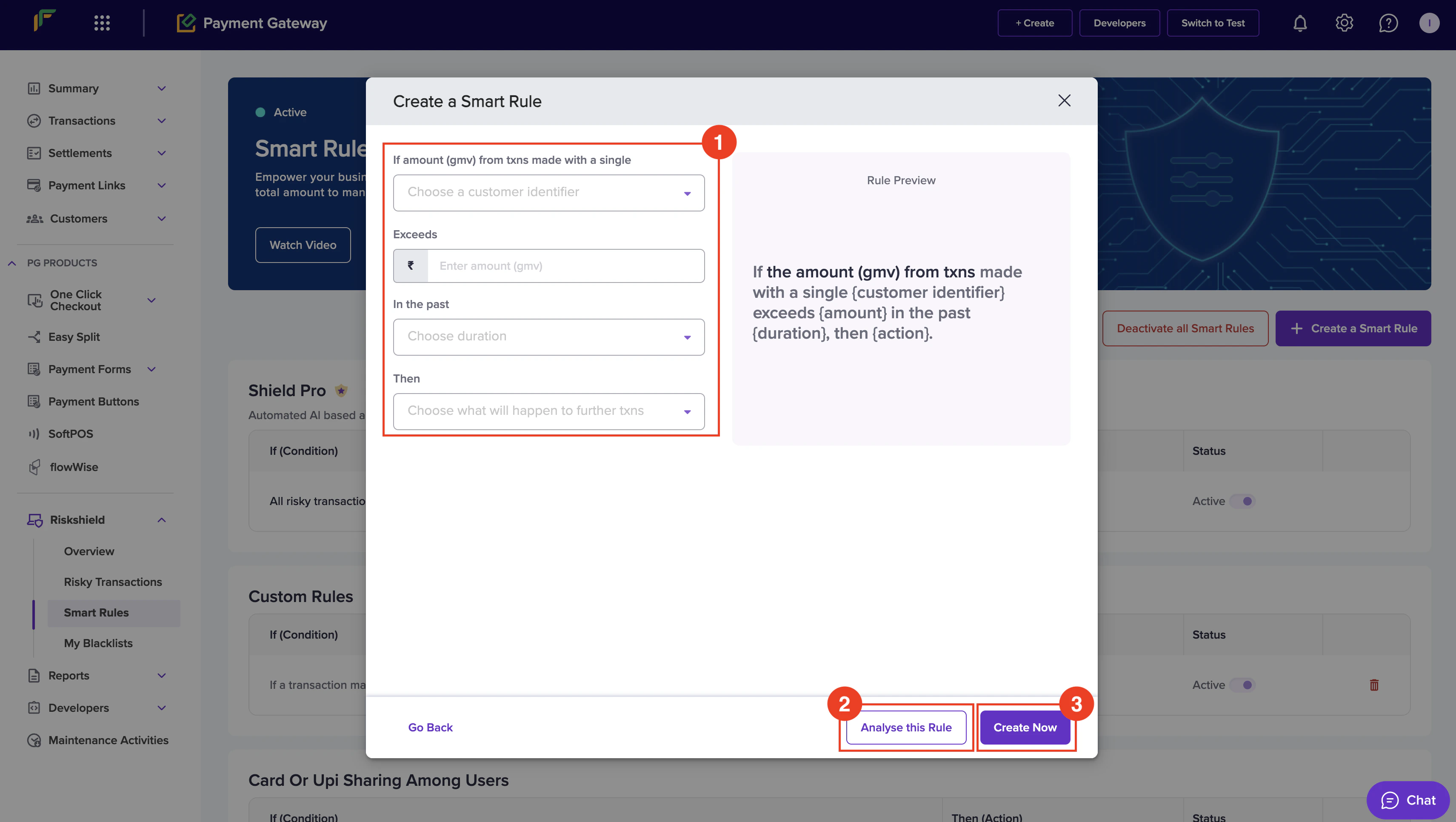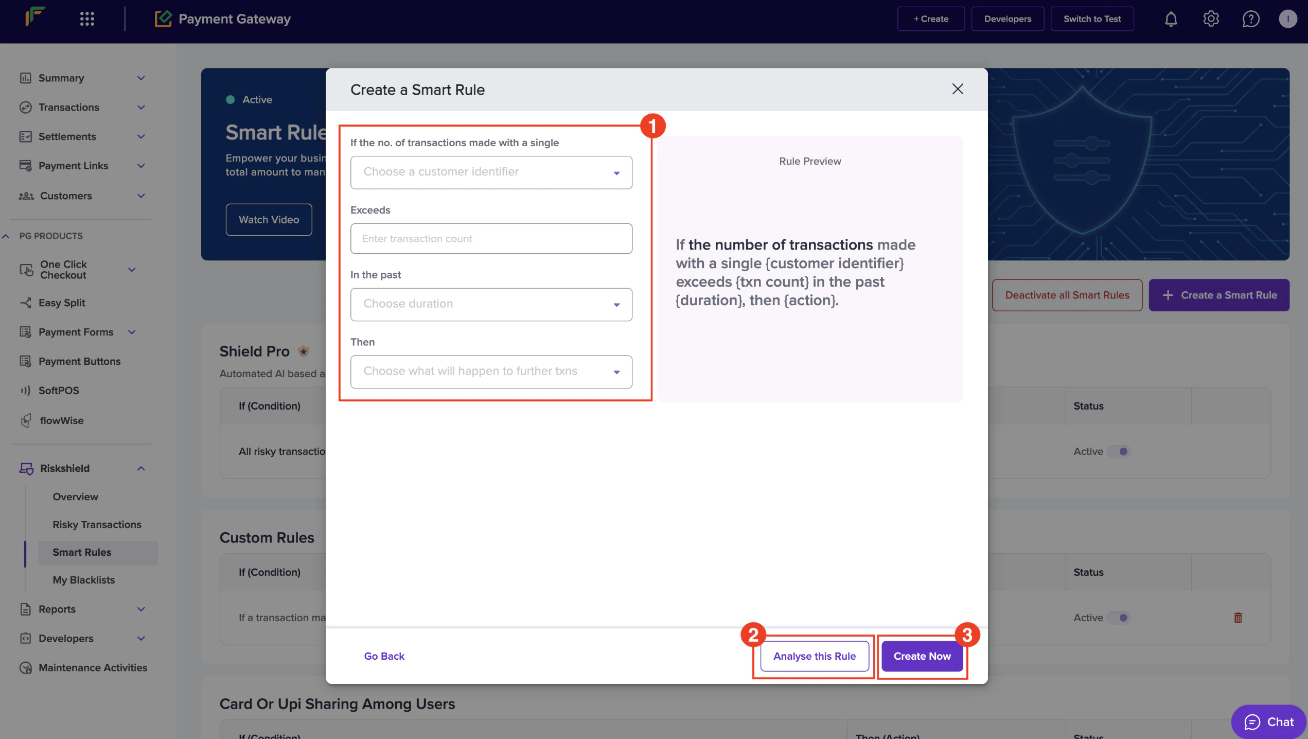 Follow the instructions below to create a smart rule based on the total number of transactions to prevent fraudulent activities:- In the Create a Smart Rule popup, enter the following information: