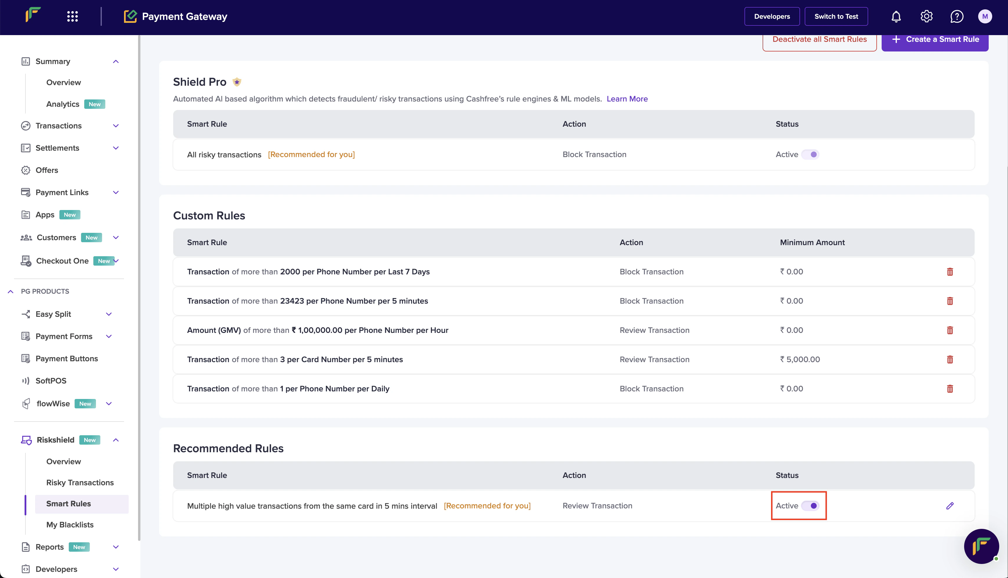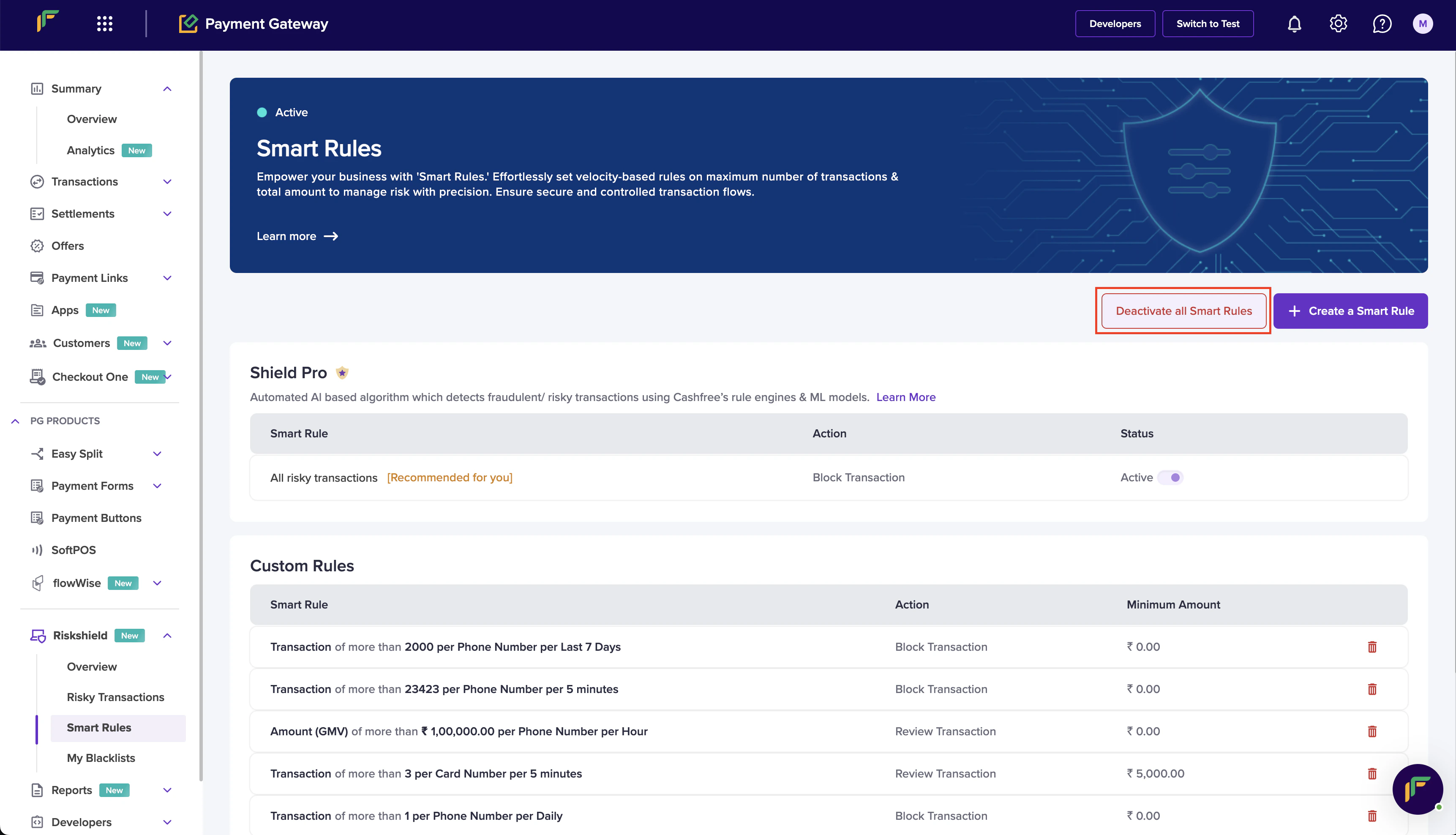 Easily modify and delete smart rules ensuring flexible and effective fraud prevention management.Activate and deactivate all smart rules