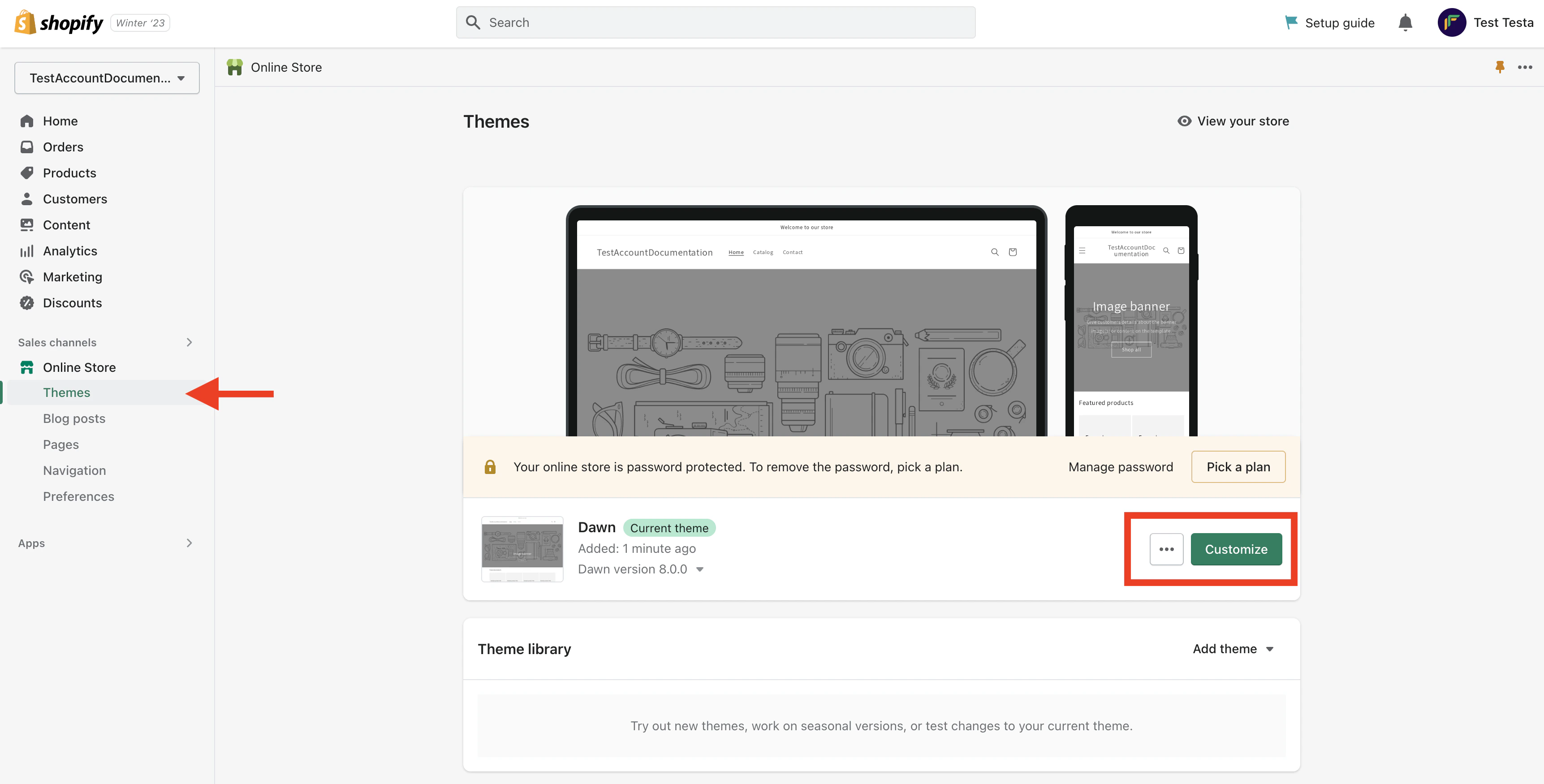 - Go to Shopify store admin > Sales channels > Online Store > Themes and click Customize.