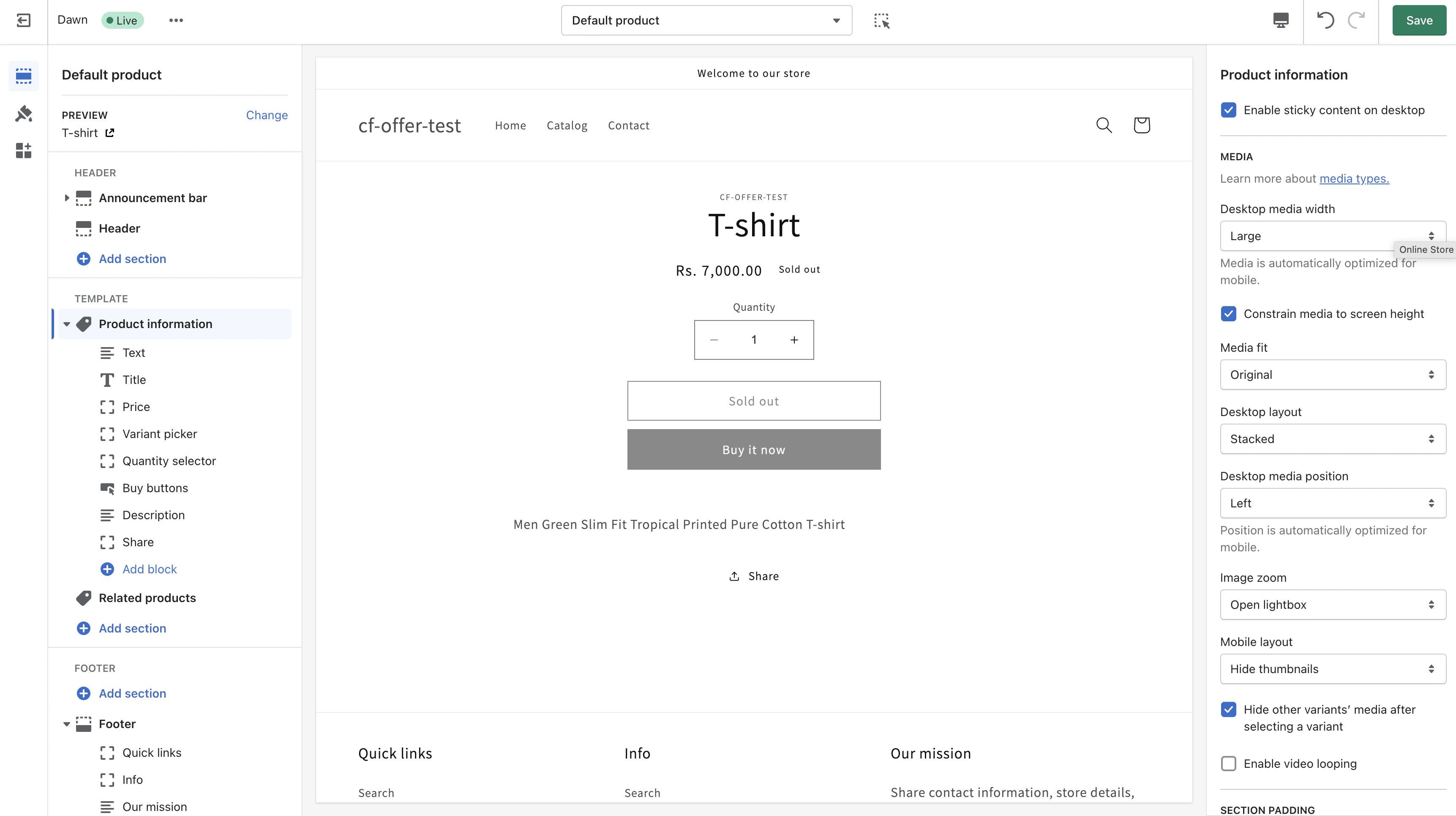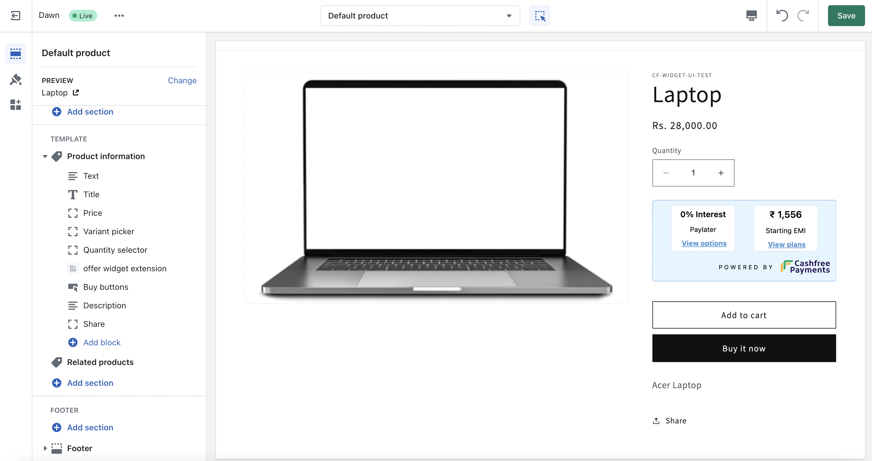 - Click the Add block option and select offer widget extension. Drag this block and place it below the product price preferably or place it according to your convenience. Click Save.