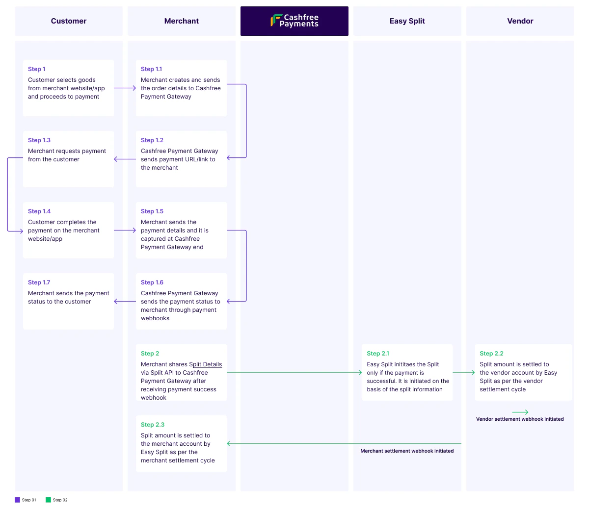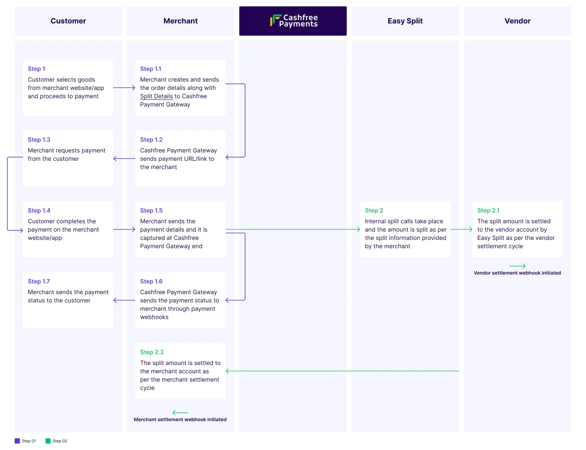 - Step 1.5: The payment details are stored in the Cashfree system, and the payment status is sent to the merchant through payment webhooks. Easy Split initiates the split irrespective of the payment status.