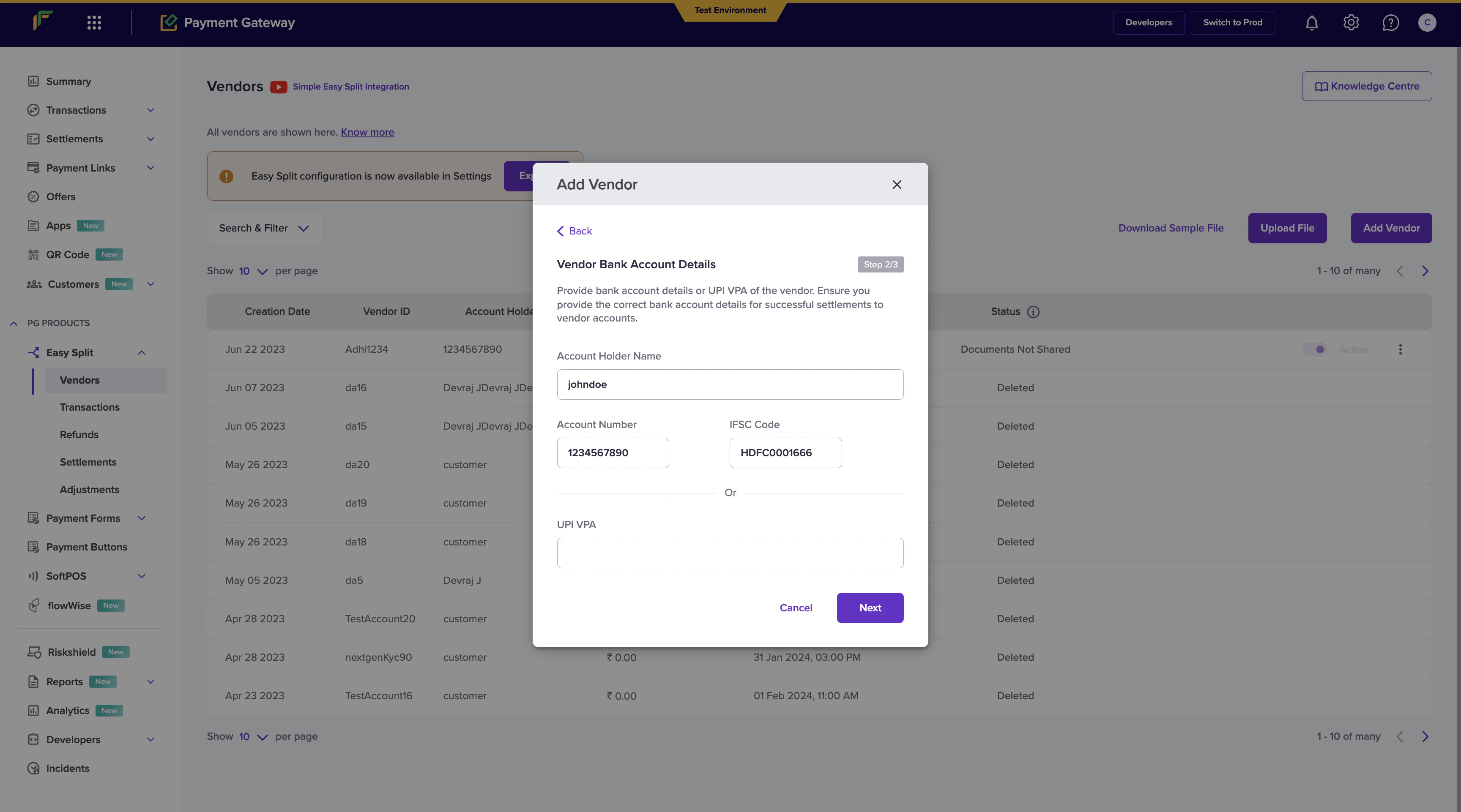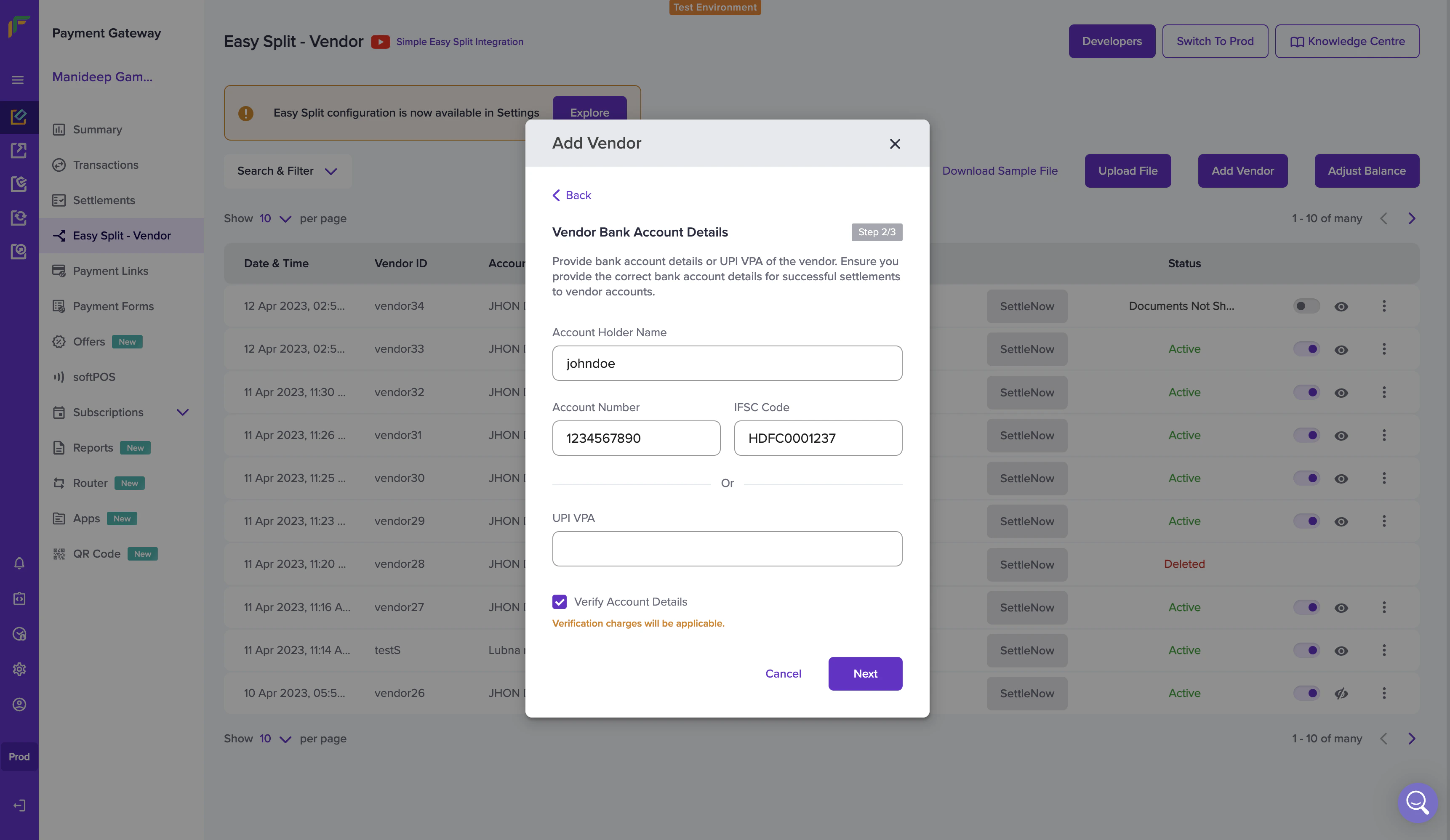 - Once done, click on Add Vendor Details. The vendor is added successfully. Vendor details are saved and can be used to process payments. The vendor details will be shown in the Easy Split - Vendor screen.