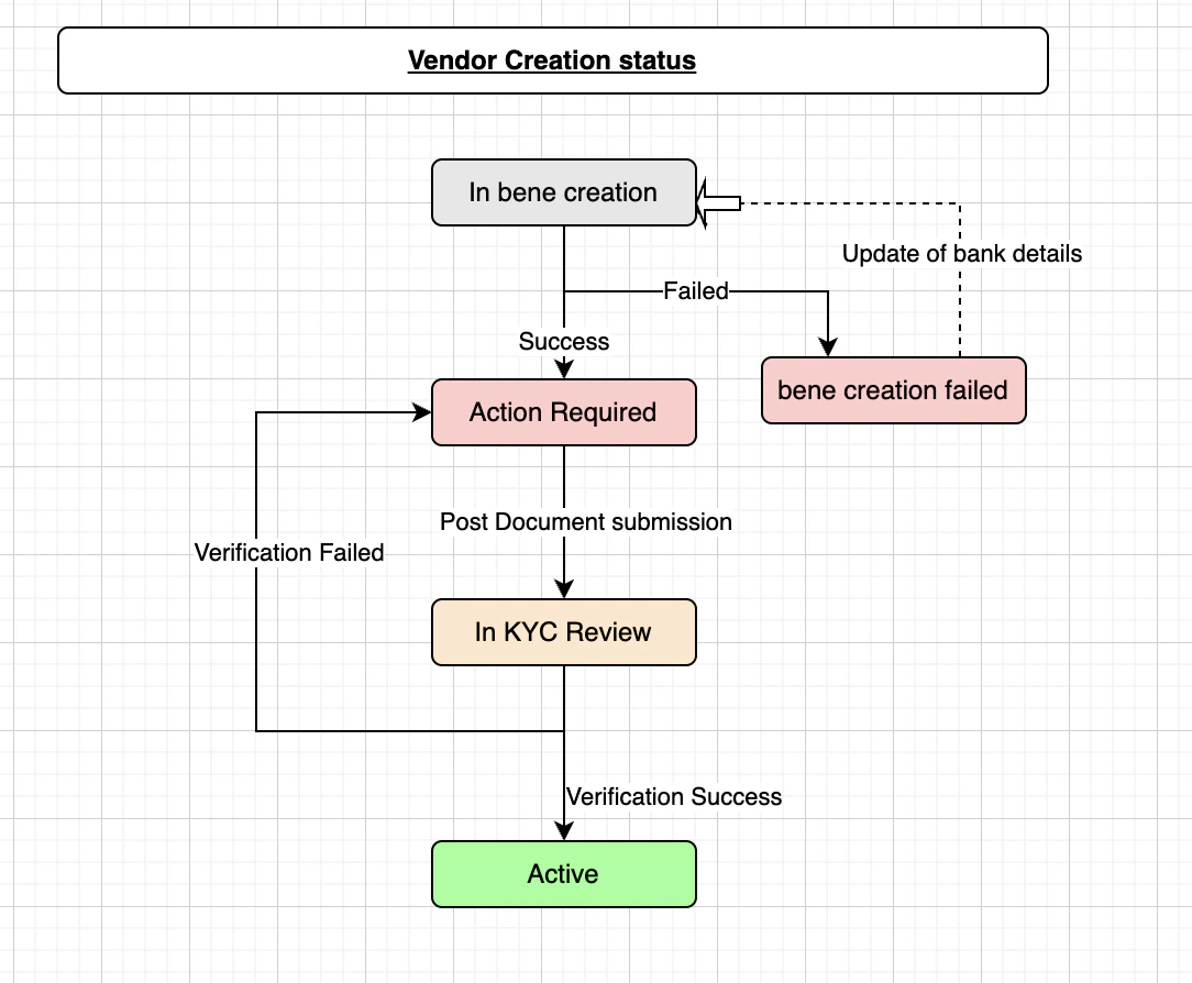When you onboard a vendor from the dashboard or use our APIs, they go through various states. They are explained in the section below. The various vendor status during the onboarding process is mentioned in the table below.| Vendor Status | Description |