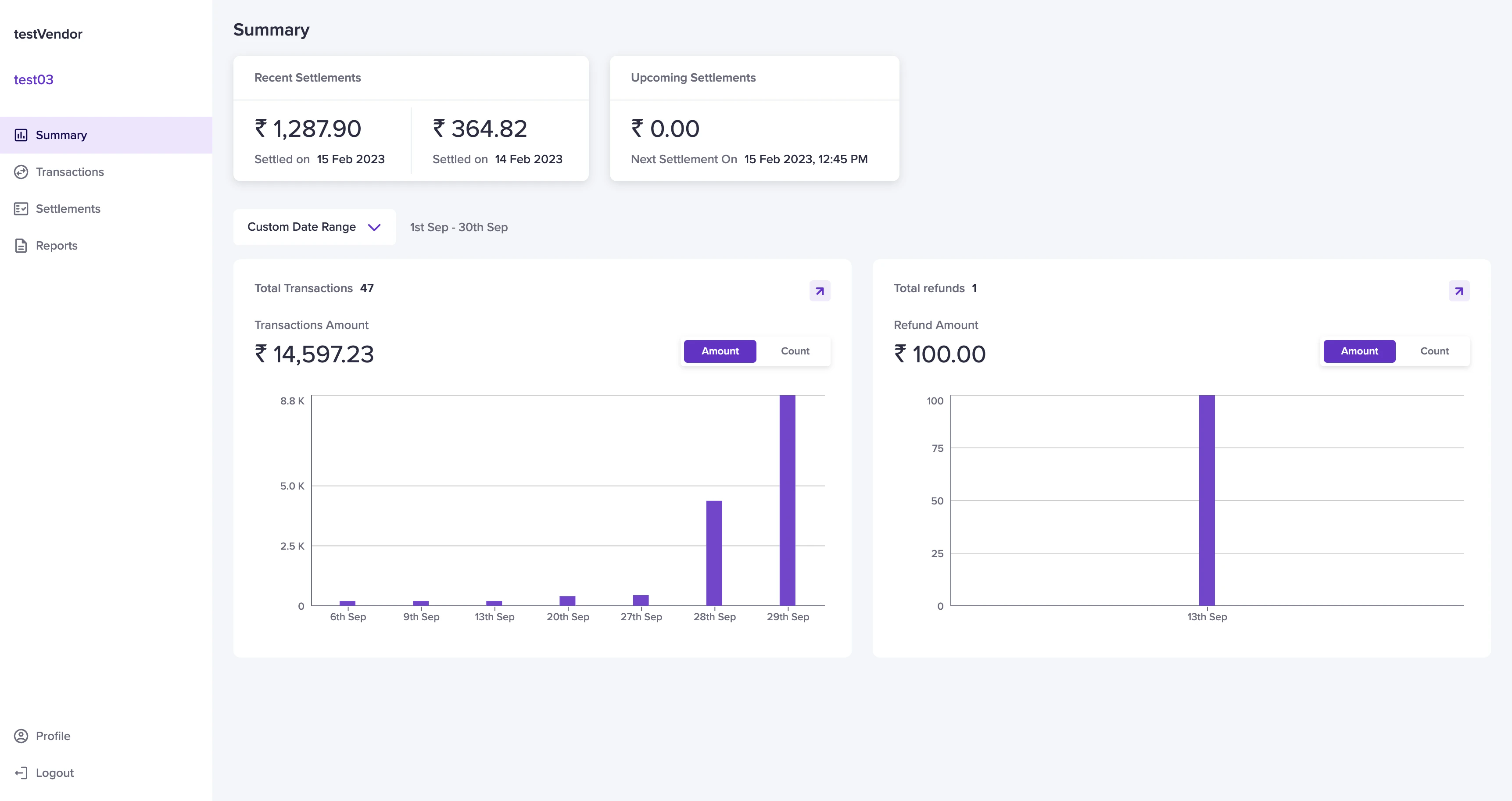Once the vendor logs in to the vendor dashboard, they can view the Summary tab. This tab displays:- Recent settlements