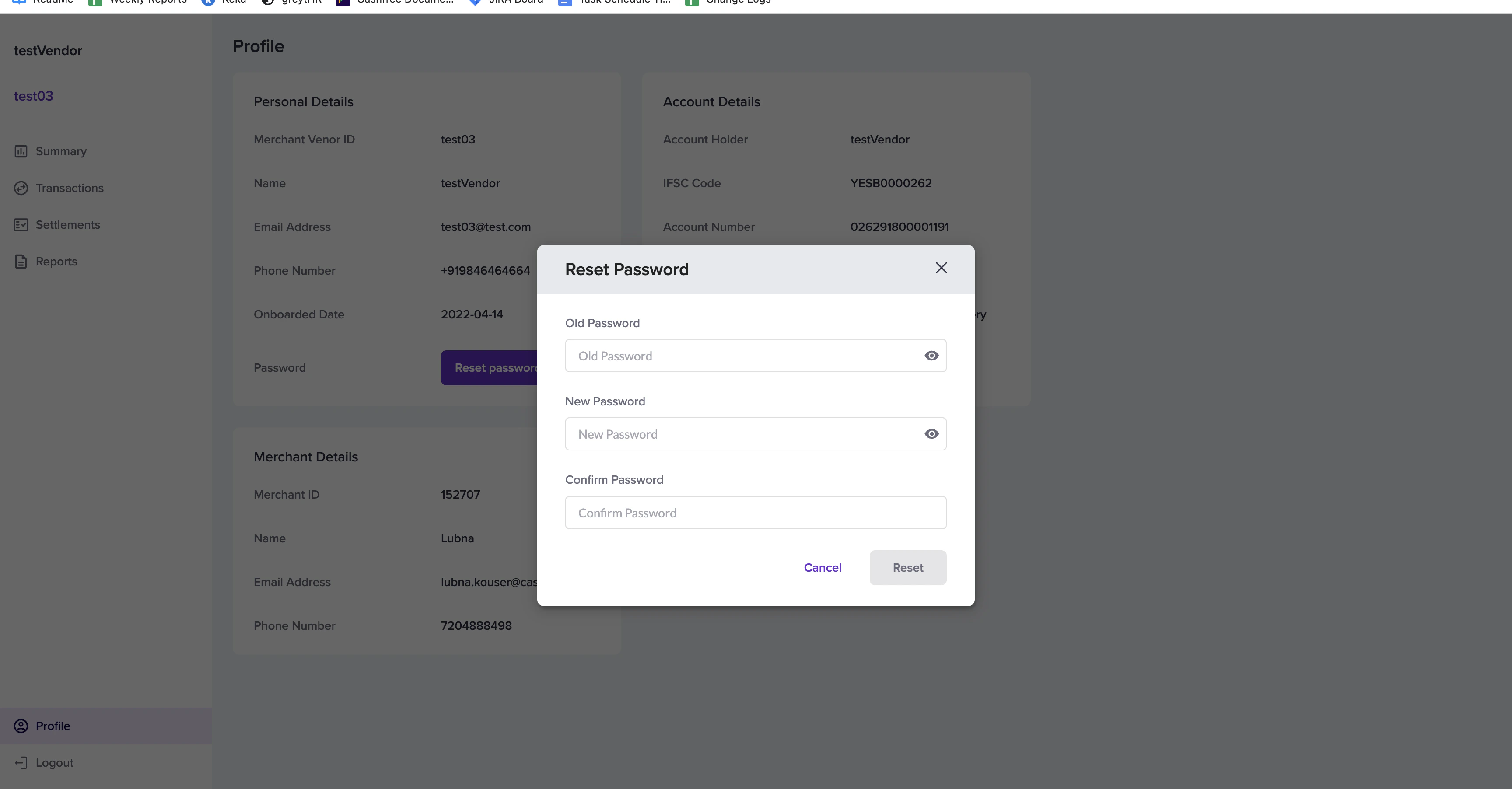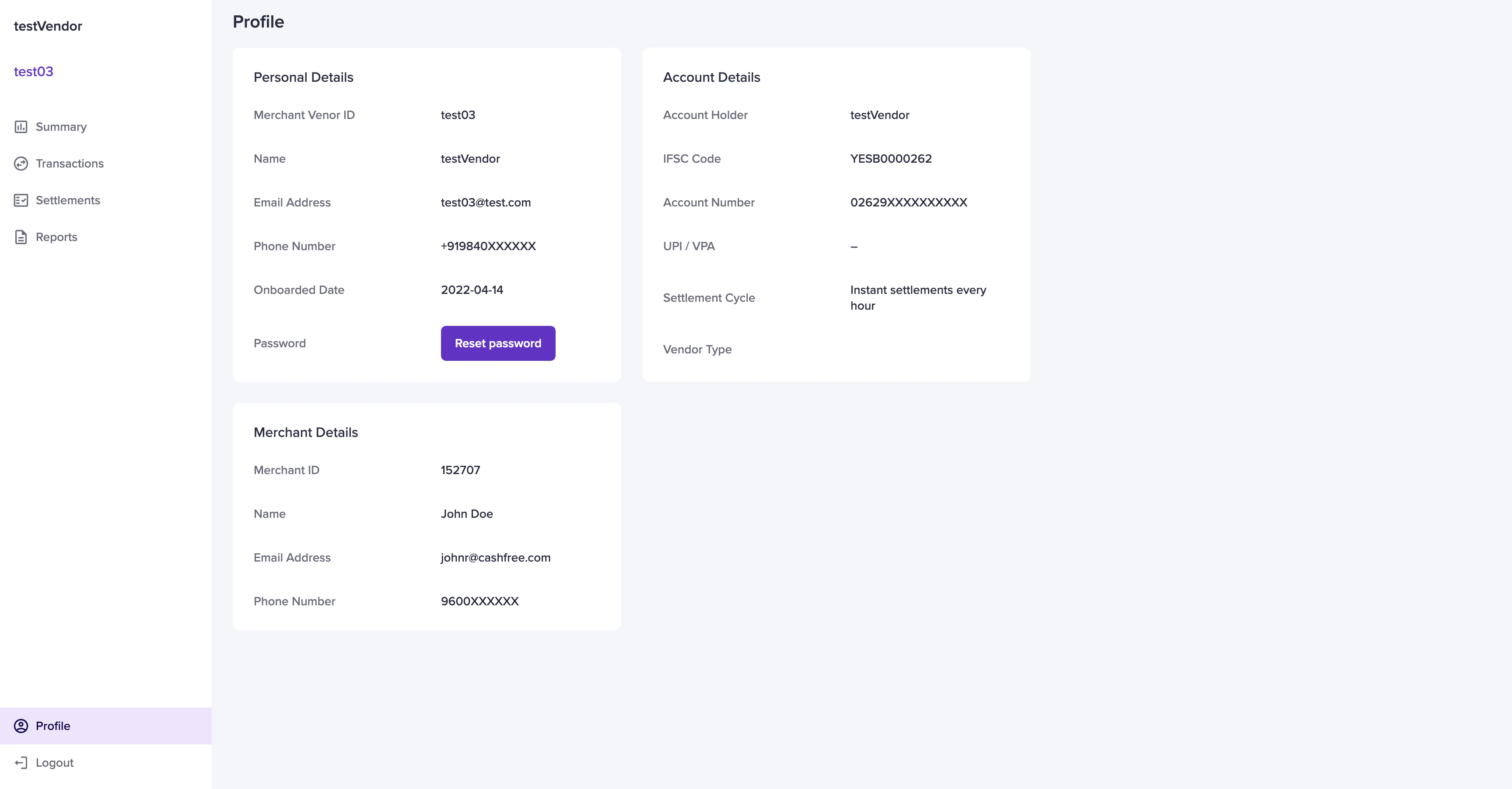 The Personal Details section includes:- Merchant Vendor ID – Unique vendor ID