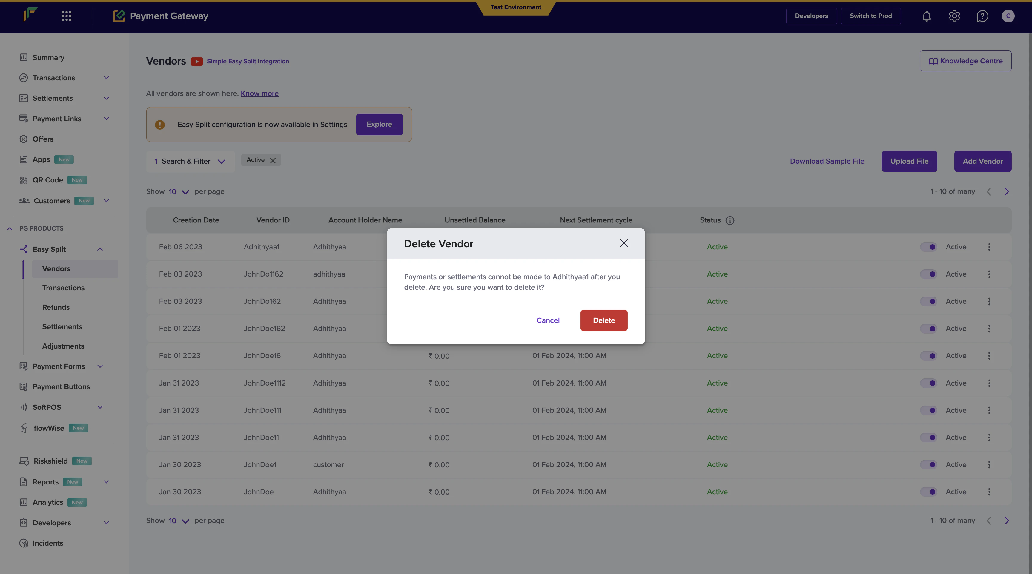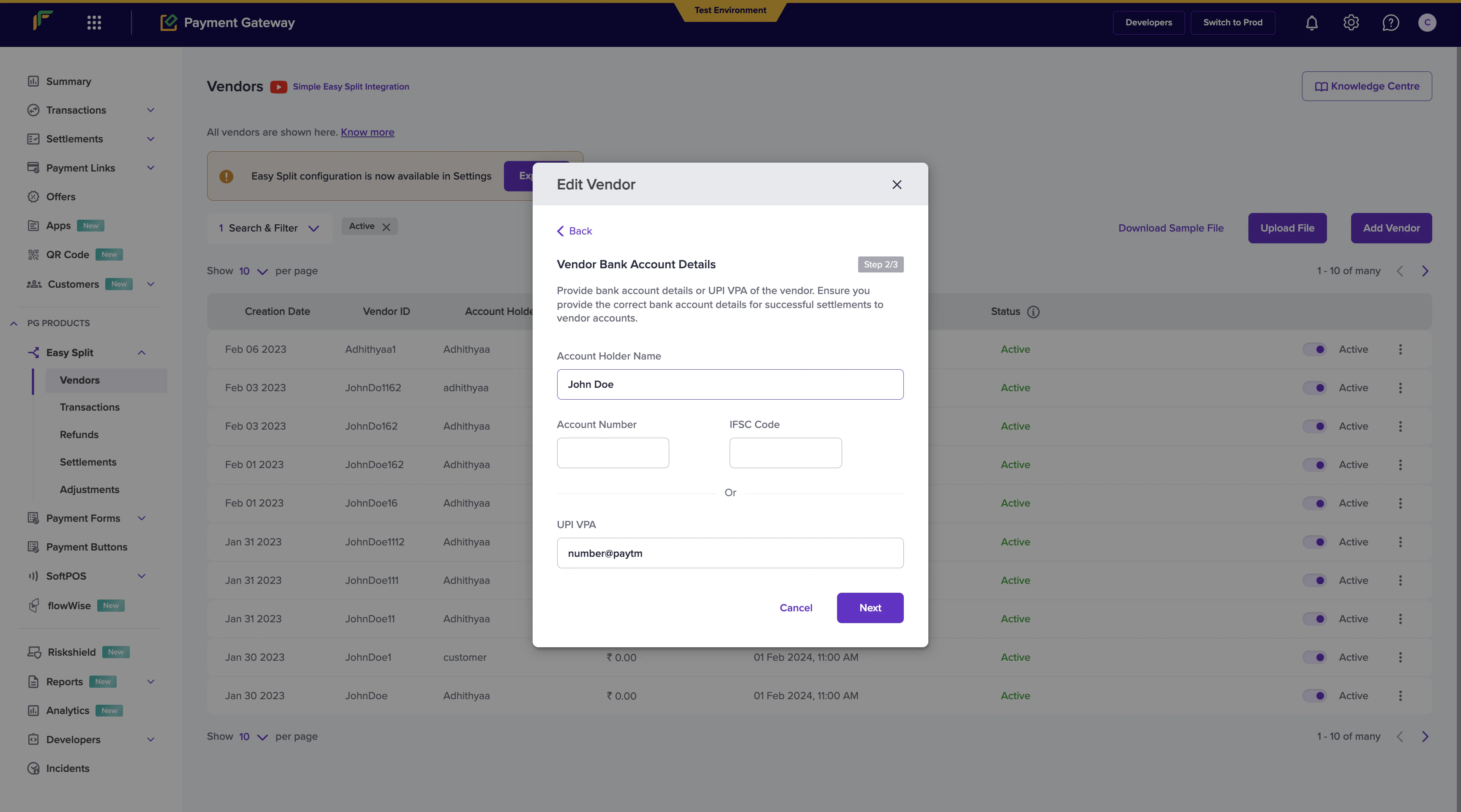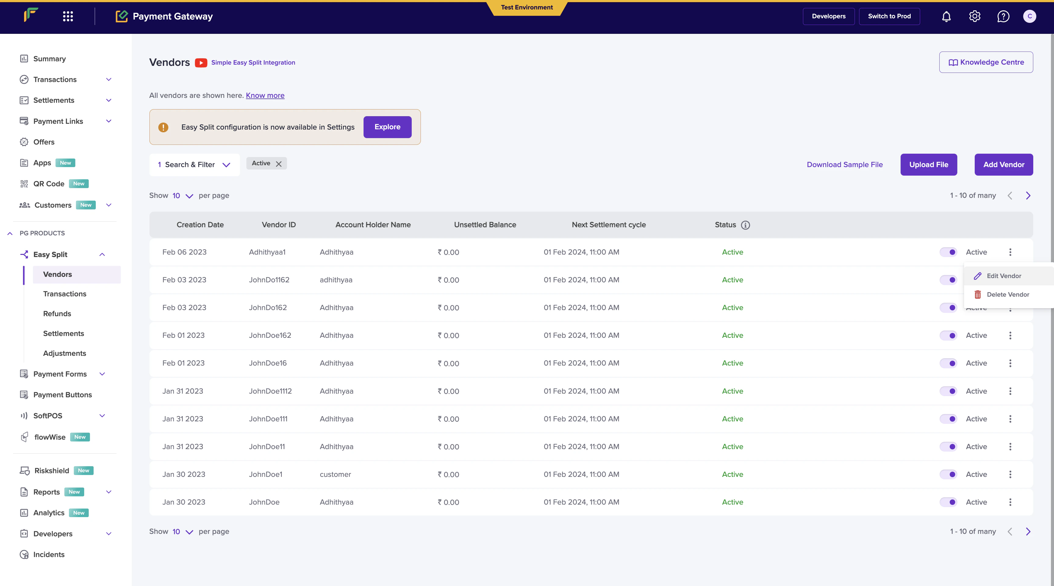 - Go to Payment Gateway Dashboard > Easy Split - Vendor.