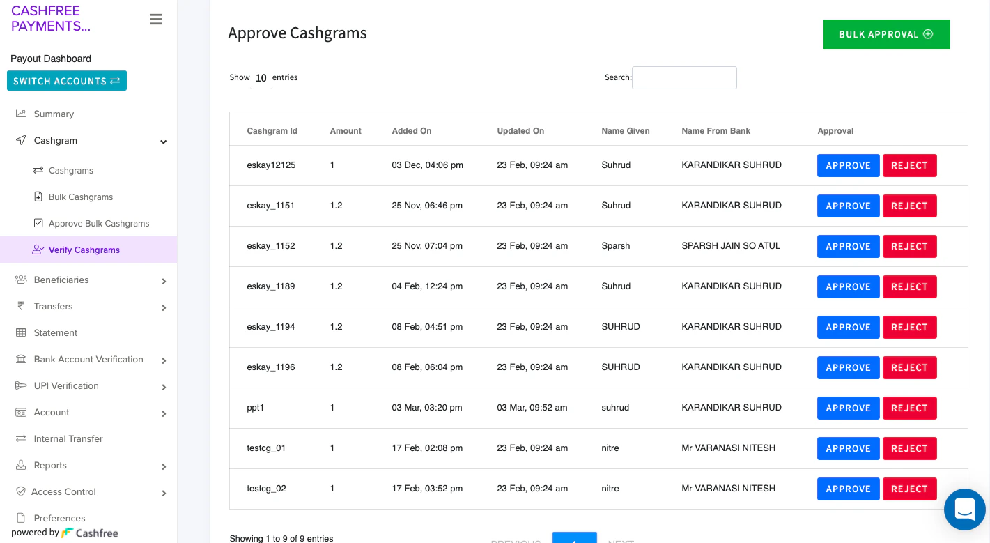 ii) If there is a mismatch, the transaction will have to be manually approved from the Verify Cashgrams section.