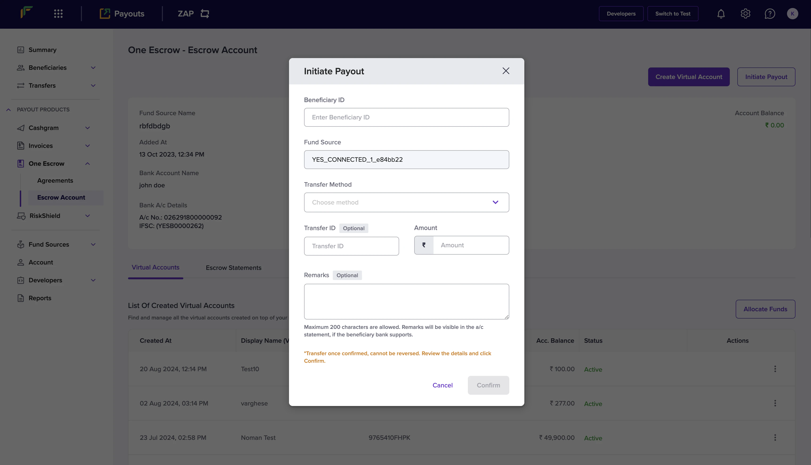 Follow the instructions below to initiate a payout from the virtual account:- Login to the Payouts dashboard using your credentials.