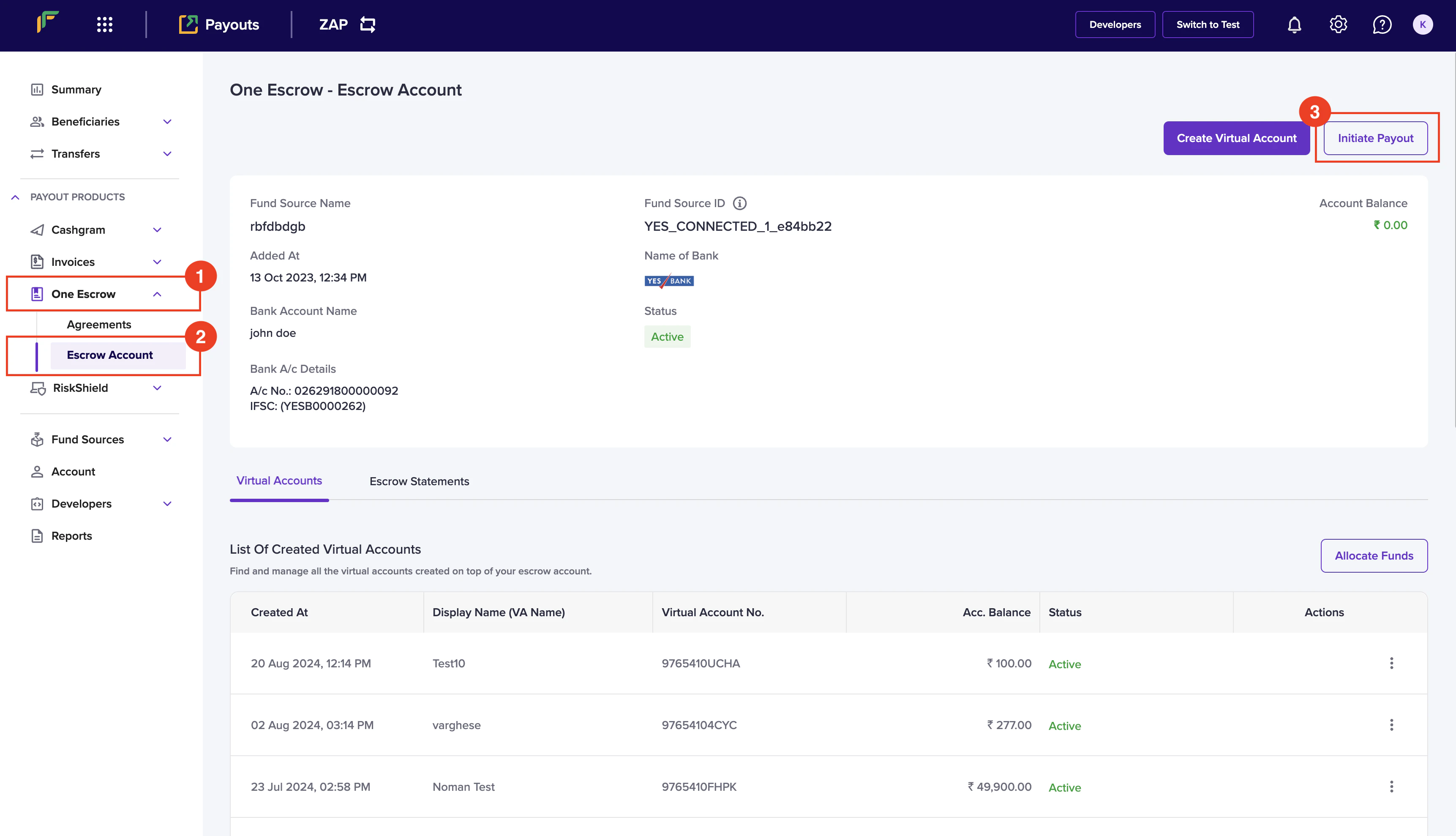 - Click Allocate Funds in the One Escrow - Escrow Account page.