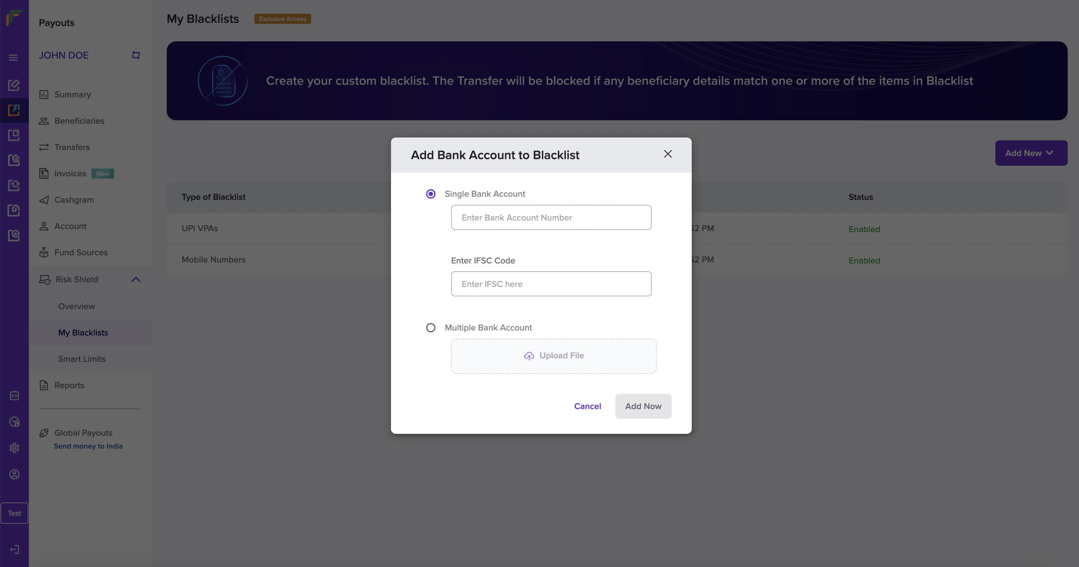 My Blacklists allows you to block a beneficiary by adding any of the information: mobile number, email ID, UPI VPA, and bank account. Once you login to the Payouts dashboard using your credentials, navigate to Payout Protect > My Blacklists.