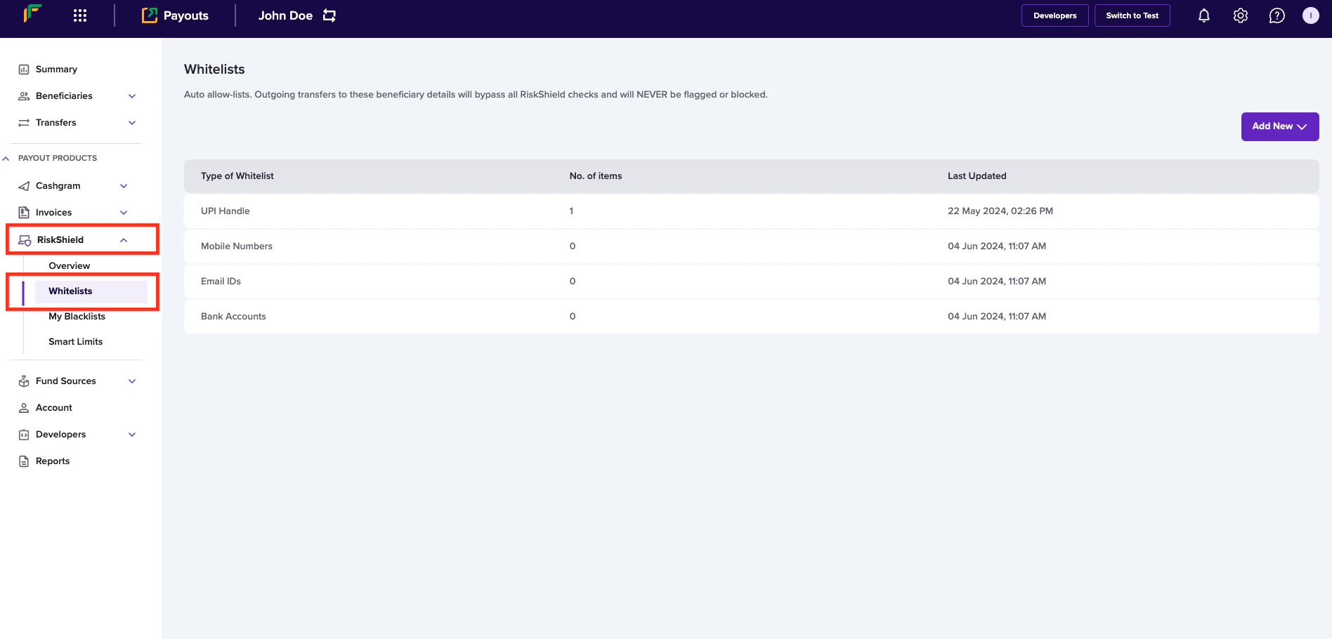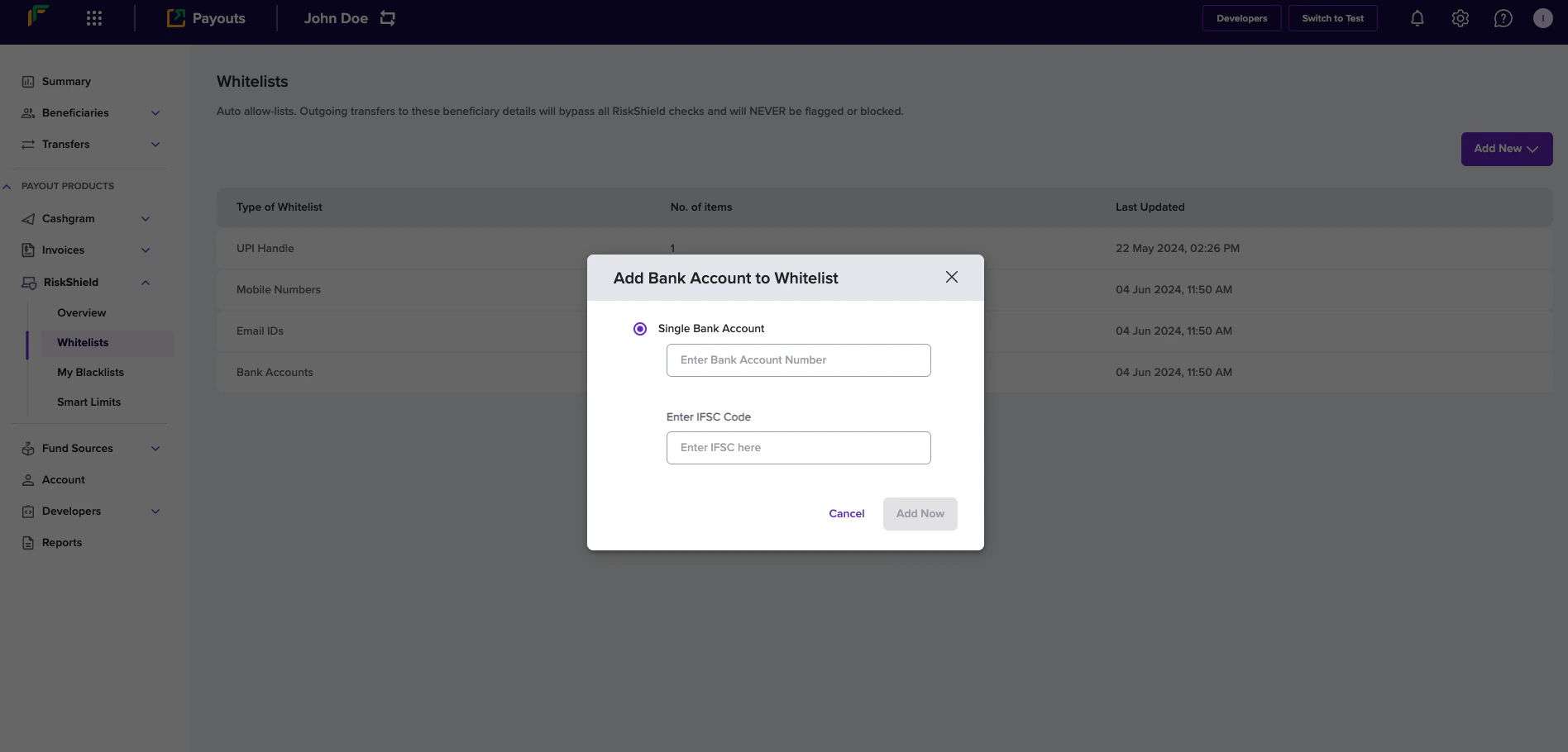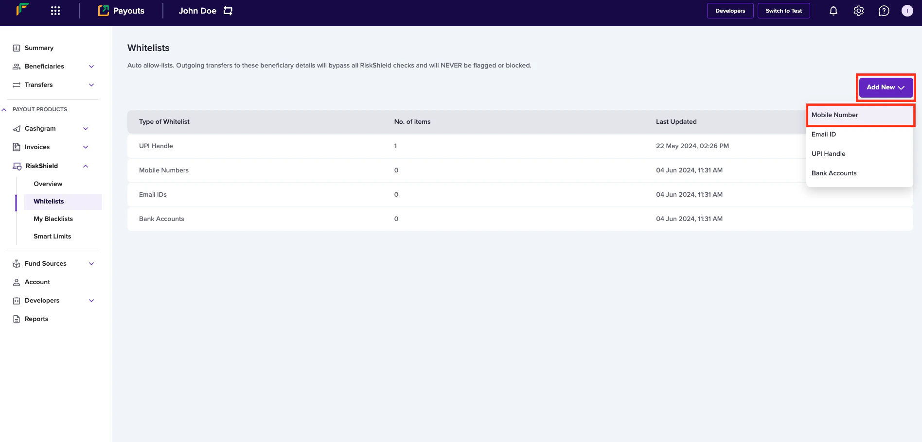 Whitelists allows you to always initiate a transfer to a beneficiary by adding any of the information: mobile number, email address, UPI VPA, or bank account information. Once you login to the Payouts dashboard, navigate to Payout Protect> Whitelists.
