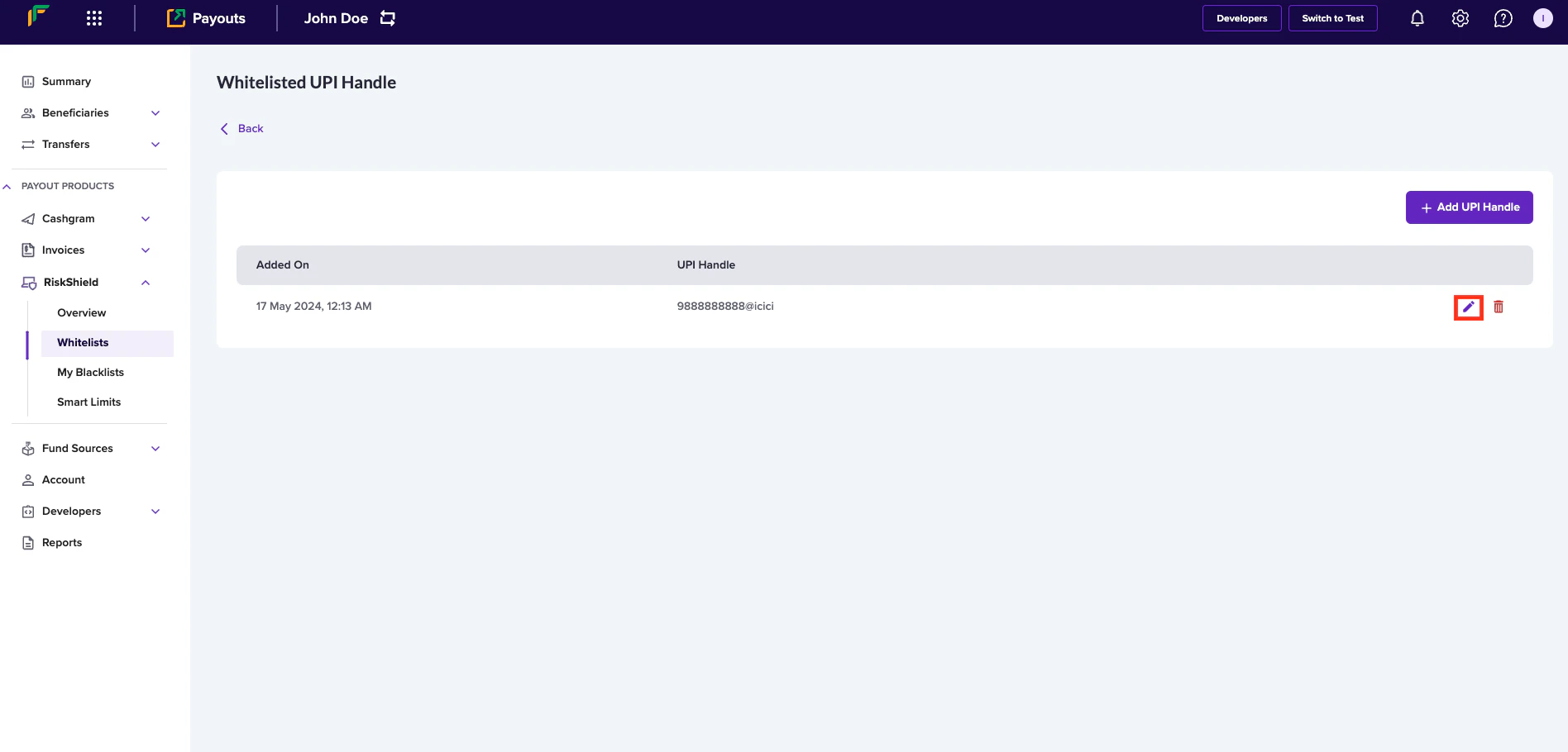 Follow the instructions below to edit the UPI VPA information of the beneficiary added to your whitelist:- Click UPI Handle from the Whitelists screen.