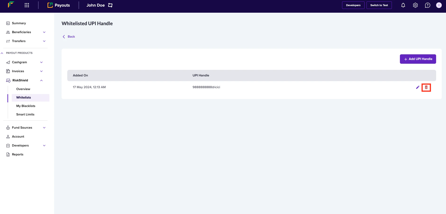 Follow the instructions below to delete a beneficiary’s UPI VPA information from your whitelist:- From the list of UPI information, click the Delete icon against the UPI information that you want to delete.
