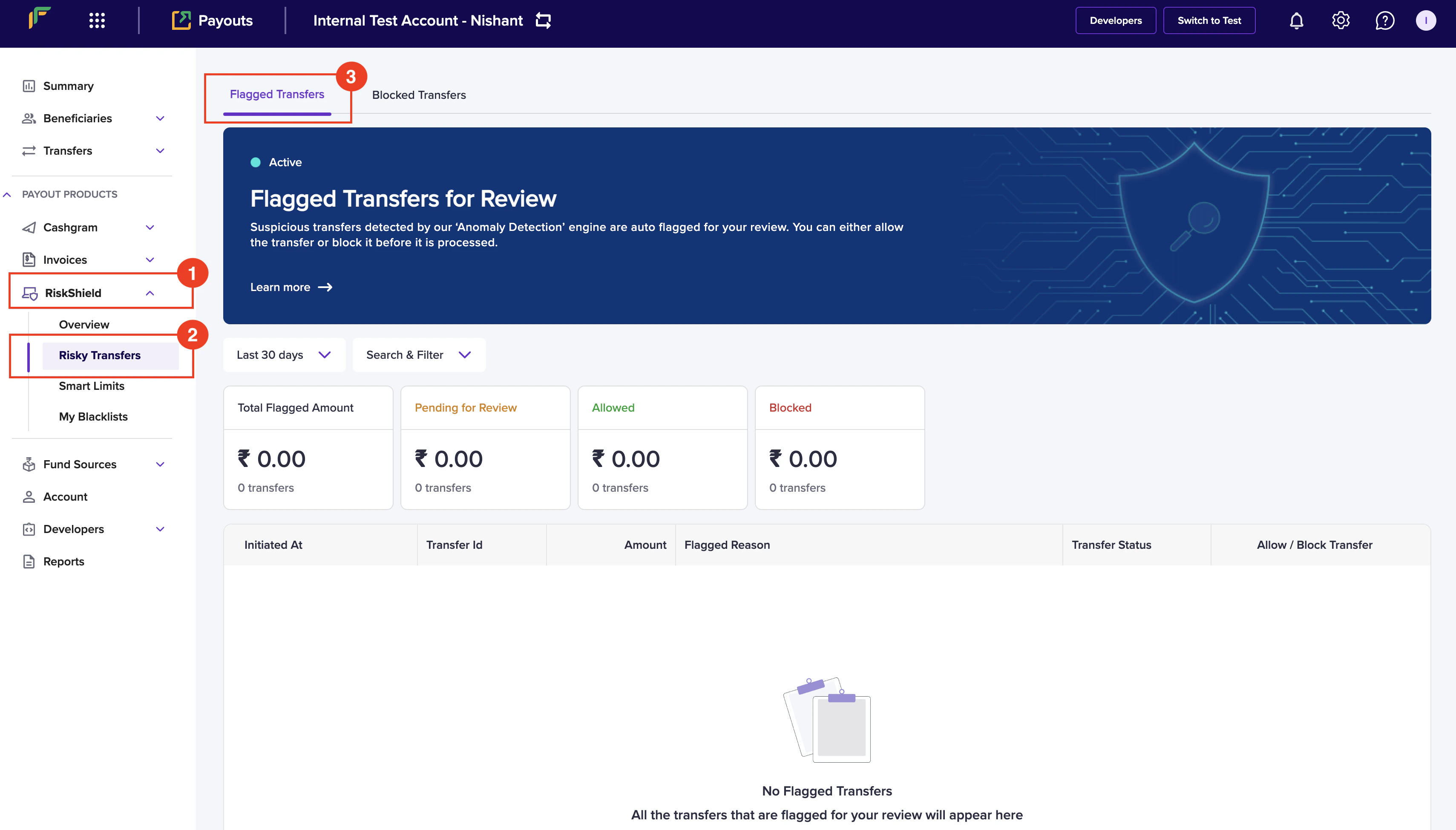 We put in the transfers for your review under the Flagged Transfers tab. The idea is for our merchants to review the authenticity of the initiated transfer and decide to approve or reject the transfer. Follow the instructions below to view the transfers for review:- Once you log in to the dashboard using your Cashfree Payments credentials, navigate to Payout Protect > Risky Transfers.