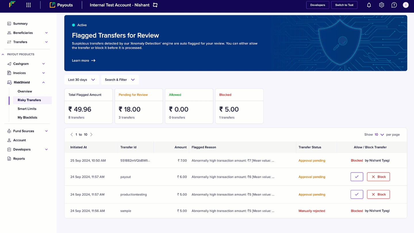 A blocked transfer cannot be unblocked. The transfer journey of that specific transfer ends here. The screen gives you the data of the number of transfers scanned, blocked, and the amount protected. To view the blocked transfers, follow the instructions below:- Log in to the dashboard using your Payouts credentials and navigate to Payout Protect > Risky Transfers.