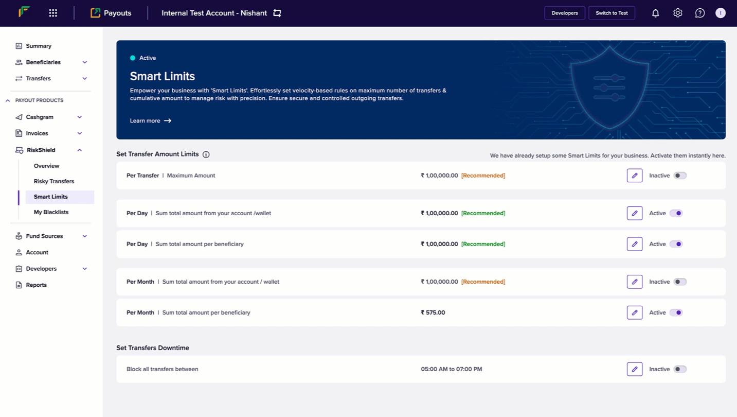 - Navigate to Payout Protect > Smart Rules > Set Transfer Count Limits.