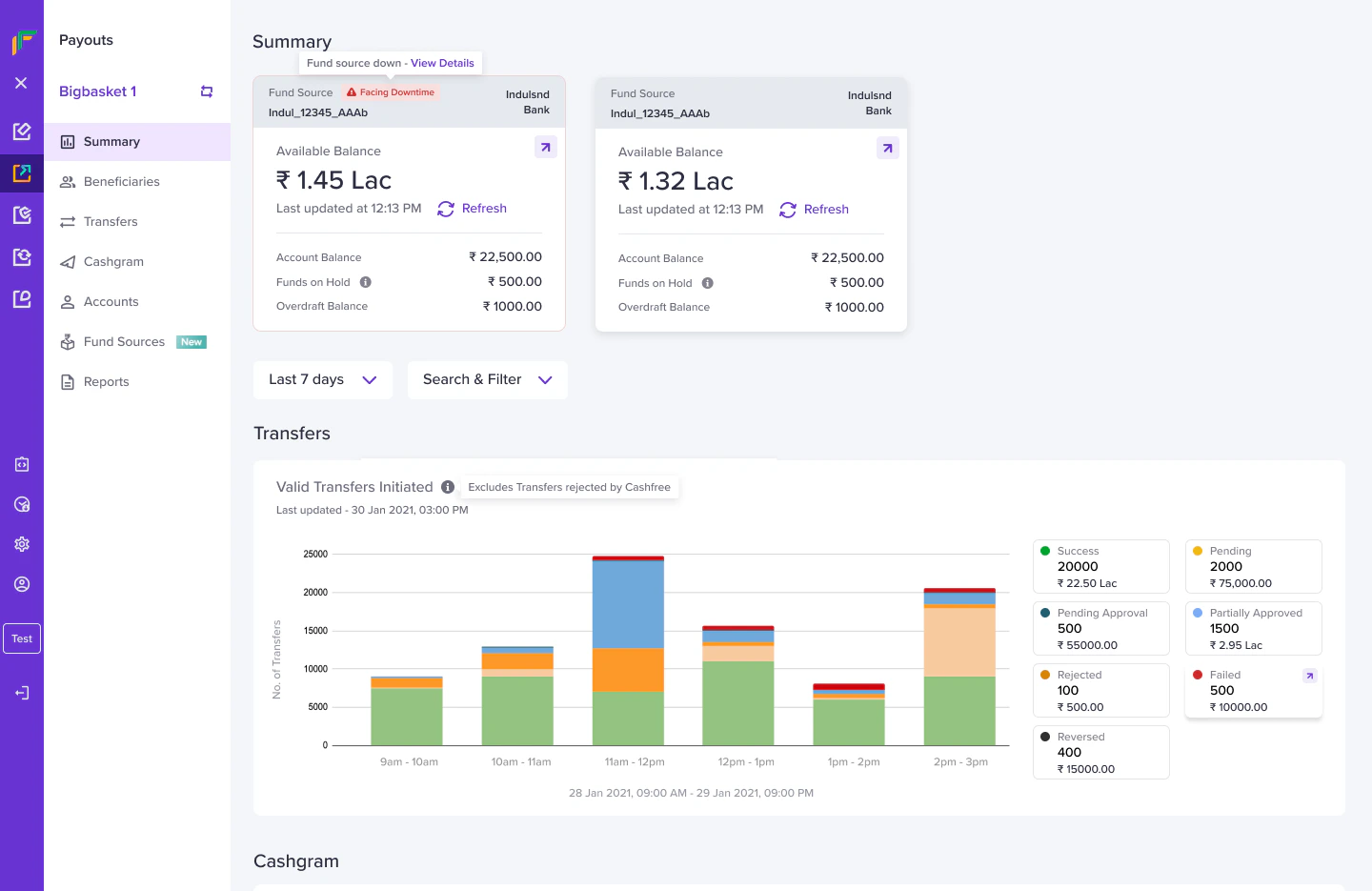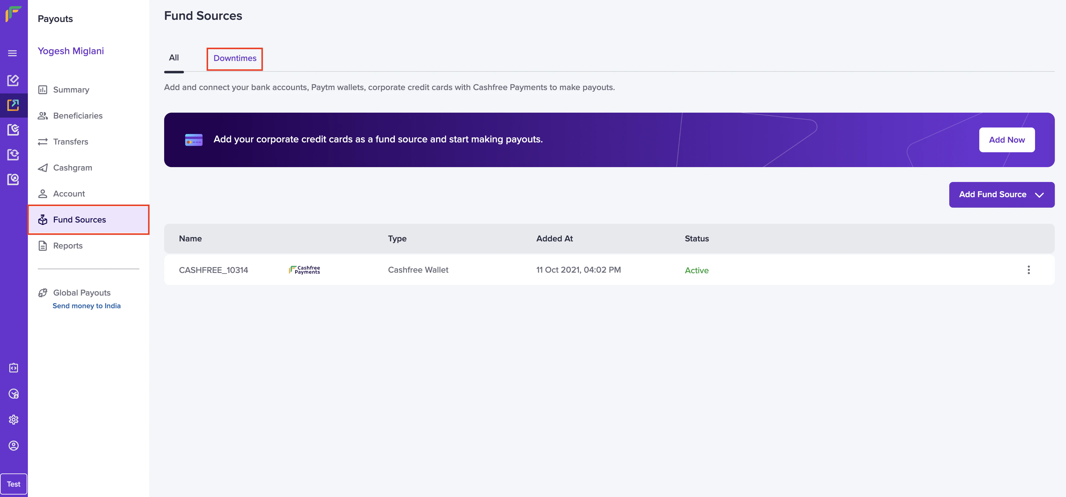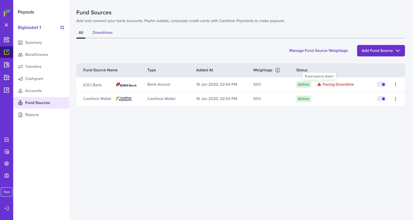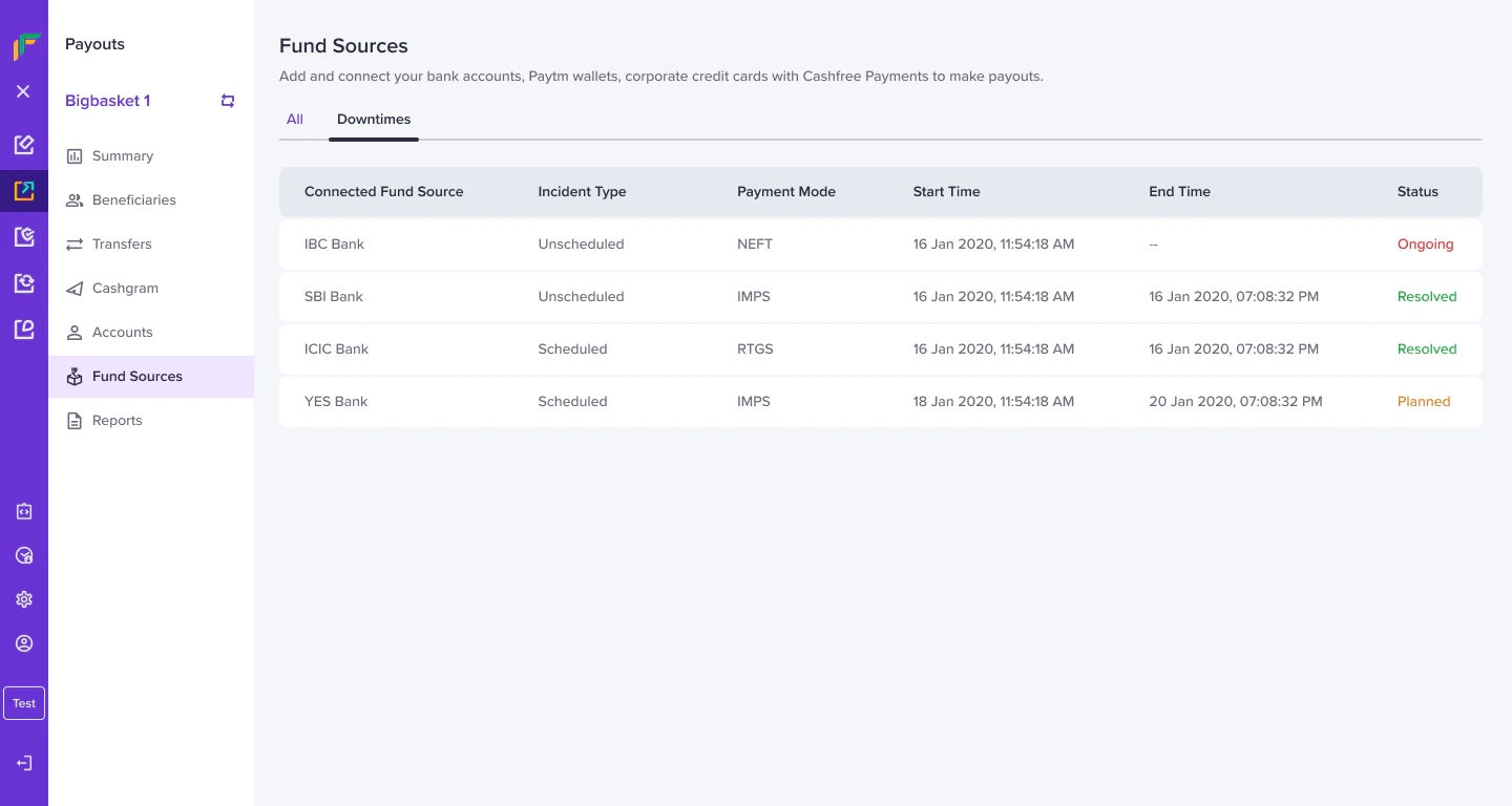 Follow the instructions below to view the downtime incidents:- From the Payouts dashboard, click Fund Sources > Downtimes.