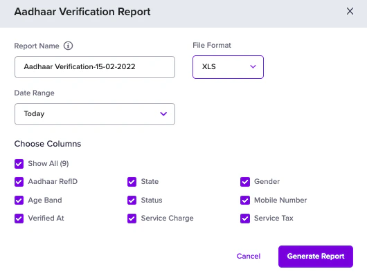 - Go to the Verification Suite Dashboard > Reports > select Aadhaar Verification in the Report Type field.
